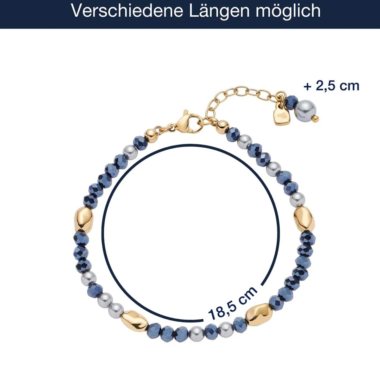 Das Armband ALINE ist die perfekte Ergänzung zur gleichnamigen Kette – oder ein stilvoller Blickfang für sich allein. Tief nachtblaue Glasperlen, natürlich wirkende, graue Perlen und glänzende Goldnuggets sind kunstvoll arrangiert und ergeben ein lebendiges, harmonisches Gesamtbild. Der Karabinerverschluss mit Verlängerungskette sorgt für eine komfortable Passform – ein Schmuckstück, das Stilbewusstsein und Natürlichkeit vereint.