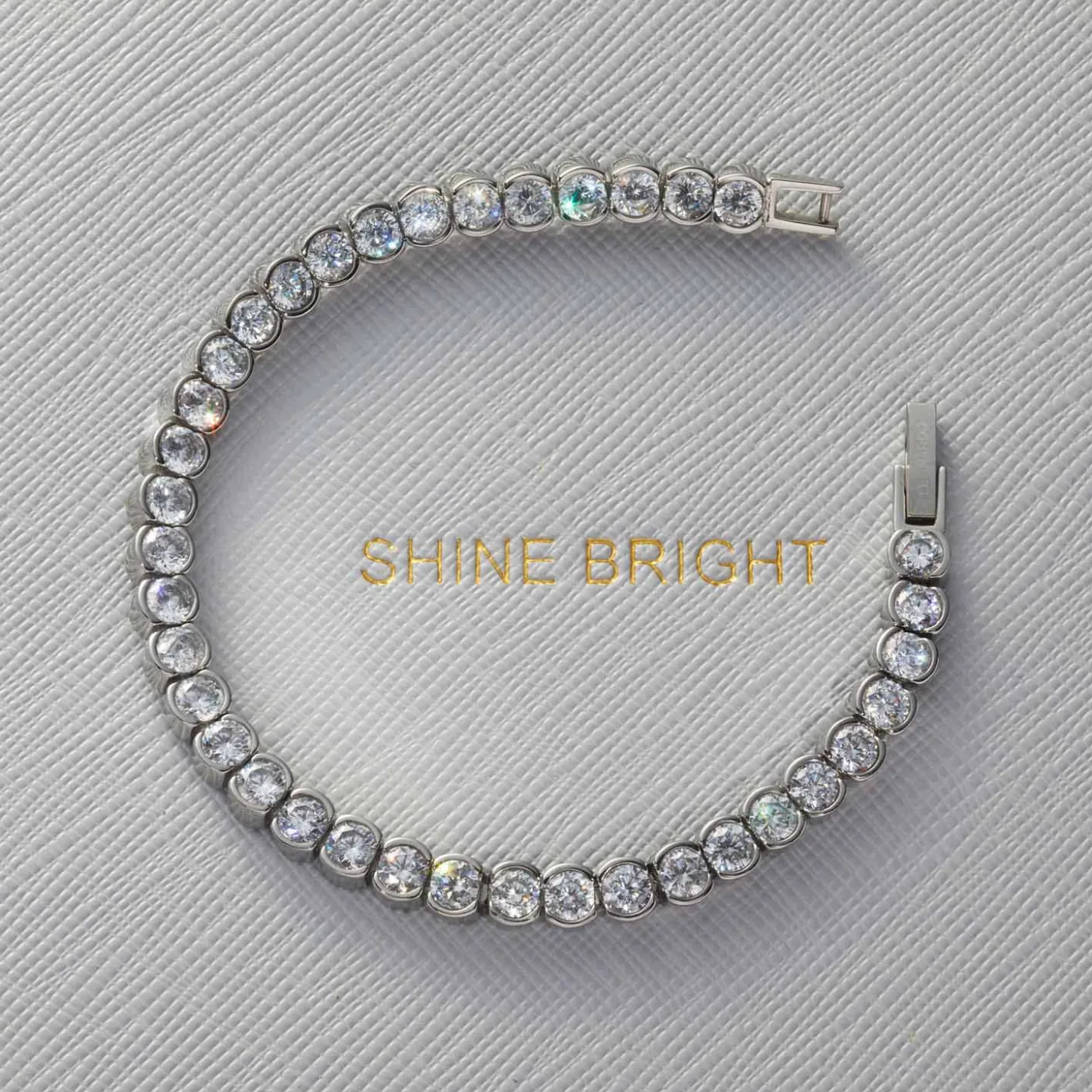 Klassisch mit funkelndem Finish – damit begeistert dieses Modell. In dem klassischen Tennisarmband reihen sich weiße, runde Zirkonia Steine aneinander. Die Fassungen sind jeweils seitlich am Übergang zum nächsten Stein durchbrochen. Mit einem Klickverschluss lässt sich das Armband leicht und sicher anbringen. Ob zum puristischen Chino-Look oder elegant zum Etuikleid – das fein glitzernde Armband setzt edle Akzente.