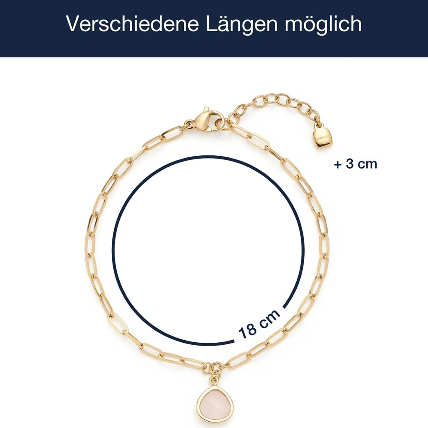 Das Armband INDRA in Gold vereint modernen Stil mit sommerlicher Eleganz. Der weiße, facettierte Glasstein bildet das Zentrum des Designs und wird von einer trendigen Paperclip-Kette aus poliertem Edelstahl mit goldfarbener Veredelung eingerahmt. Die länglich-ovalen Glieder verleihen dem Schmuckstück eine moderne, strukturierte Optik, während der helle Stein durch seine Lichtreflexe für einen dezenten Schimmer sorgt. Dank Karabinerverschluss mit Verlängerungskette lässt sich das Armband individuell anpassen und angenehm tragen. Das Armband INDRA ist ein vielseitiger Begleiter, der sich perfekt für warme Tage eignet – solo getragen oder im harmonischen Zusammenspiel mit der passenden Kette INDRA.