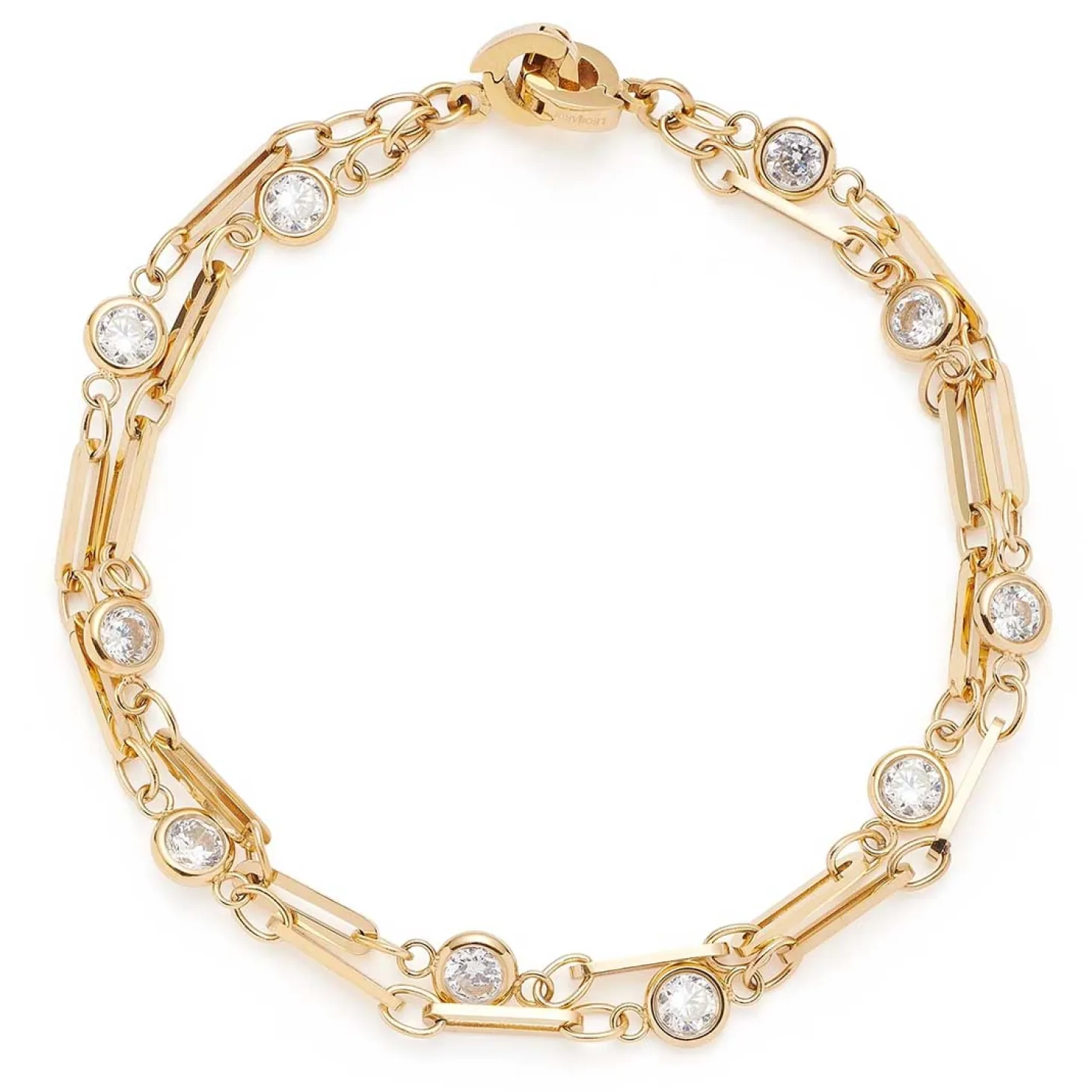 Das Armband REBECCA überzeugt mit modernem Design und edlem Glanz. Es besteht aus zwei Reihen länglich-flacher Kettenglieder, die durch runde, brillantgeschliffene Glassteine unterbrochen werden. Diese Kombination aus klarer Form und feinem Funkeln verleiht dem Schmuckstück einen Hauch von luxuriöser Eleganz. Durch die Clip&Mix-Funktion lässt sich das Armband individuell erweitern und mit weiteren Schmuckstücken kombinieren – ideal für vielseitige Styles. Zwei Clips aus Edelstahl halten das Design sicher zusammen und machen das Armband gleichzeitig zum dekorativen Element für andere Basisstücke der Serie. Das Armband REBECCA ist die perfekte Wahl für alle, die Stil, Flexibilität und Qualität schätzen.