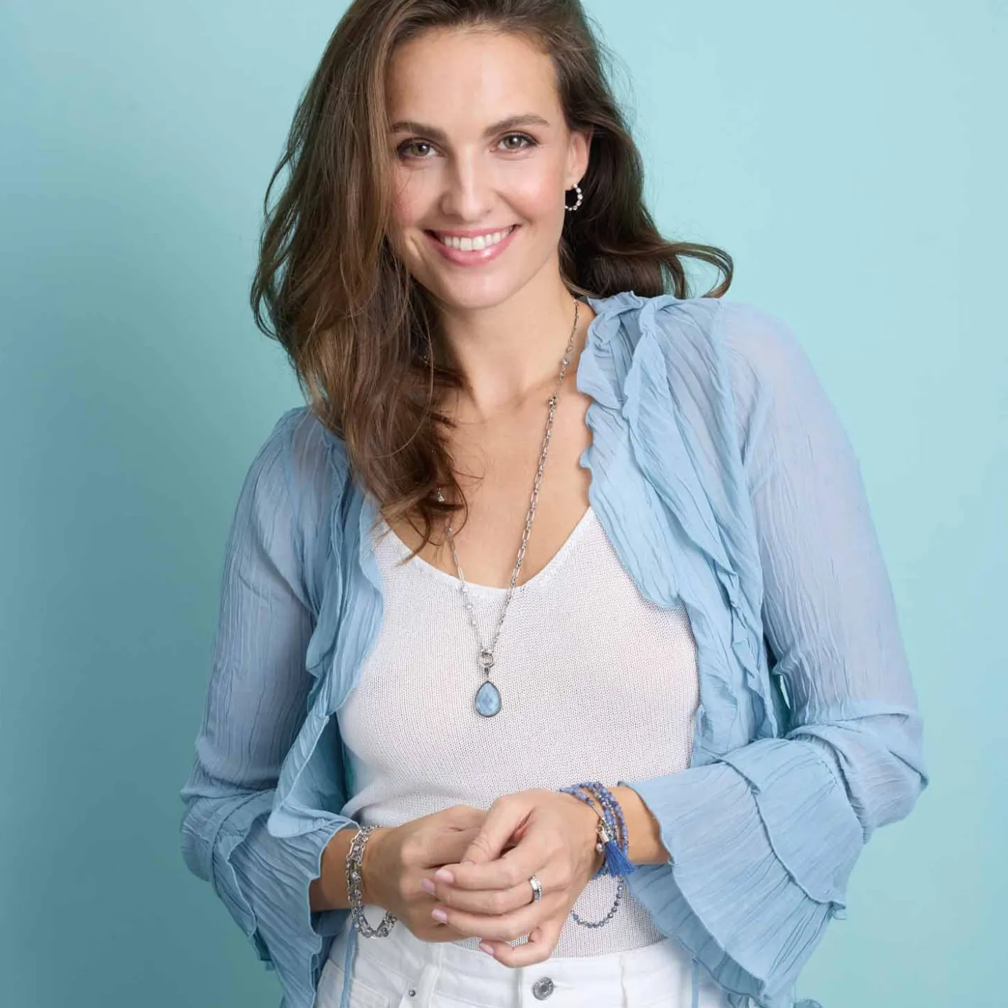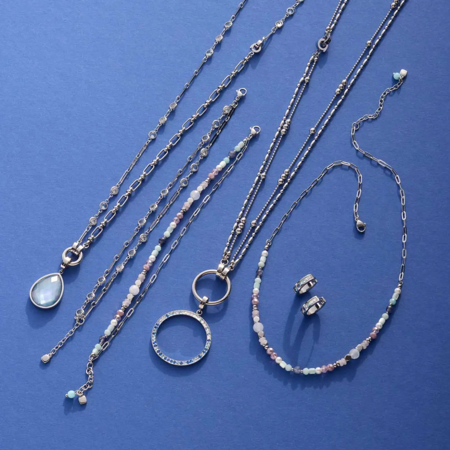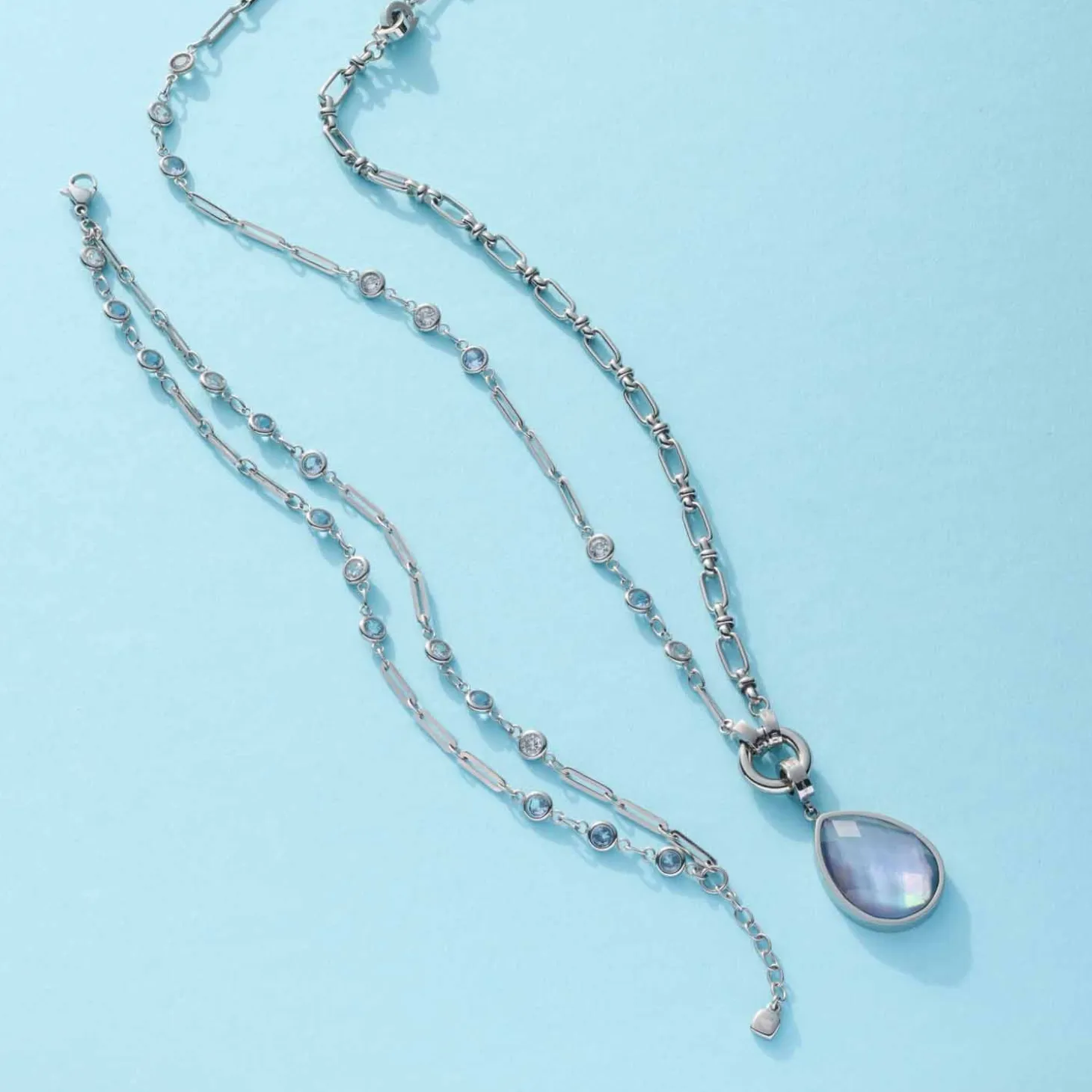Dieses doppelreihige Armband bringt Leichtigkeit in deine Outfits und macht so richtig Lust auf die ersten warmen Tage! Die Kombination aus facettierten Glassteinen in zartem Blau und Weiß und länglichen Kettengliedern macht es zu einem echten Highlight. Perfekt abgestimmt auf die passende Kette und dank Karabinerverschluss mit Verlängerungskette individuell anpassbar. Hol dir dieses Schmuckstück im cooler Layering-Optik nach Hause und trage es alleine oder mixe es mit anderen Armbändern zu einem individuellen Look.