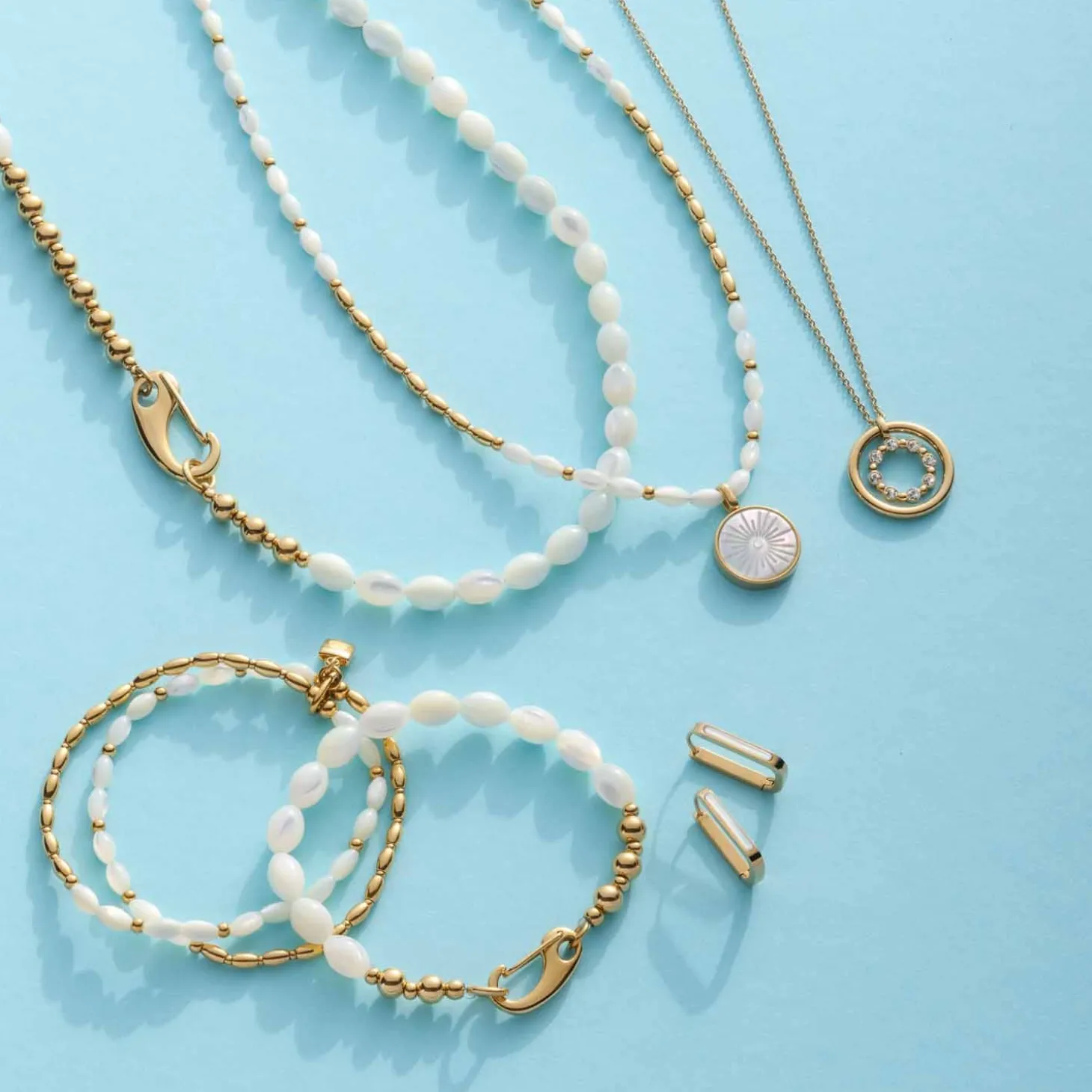 Hol dir den Sommer nach Hause. Dieses Armband mit einem Mix aus olivenförmigen Muschelperlen und Goldkugeln spiegelt die Schönheit der Sonne wider und schmeichelt sanft der Haut. Zwei Armbänder werden hier durch einen ovalen Ring zu einem zusammengehalten und können dank das Elastikbandes einfach über das Handgelenk gezogen werden. Das Armband passt sowohl zur abgestimmten Kette als auch zu weiteren Goldstücken.