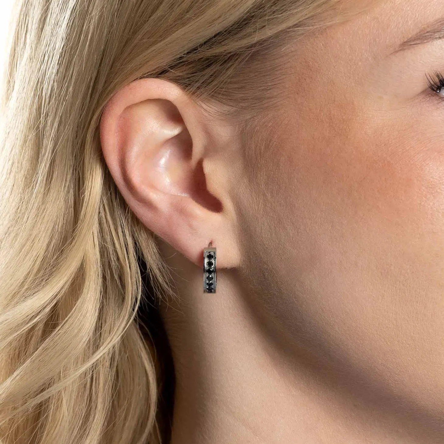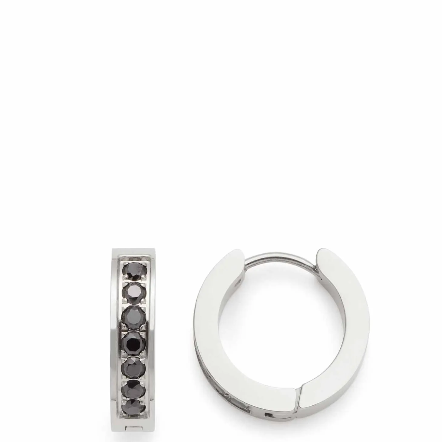 Die Creolen sind so filigran und vollenden somit nicht nur elegante Looks, sondern integrieren sich auch in entspannte Freizeit-Kombis mühelos ein. Die Creolen begeistern mit einem Mix aus Edelstahl und schwarz funkelnden Zirkona Steinchen. Auf der Vorderseite der Creole reihen sich diese kleinen Steinchen zu einer Pavé Linie aneinander. Mit ihrer Klapp-Mechanik lassen sich die kleinen Creolen leicht anbringen.