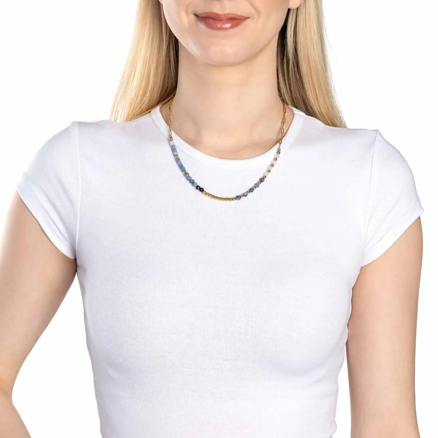 Voller Harmonie präsentiert sich diese vergoldete Halskette. Das Zusammenspiel unterschiedlicher Steine in Walzen- und Kugelform macht sie zum eleganten Hingucker. Die zarten Natursteine zeigen sich in einem sanften Verlauf von weiß zu blau. In der Kombination mit poliertem Gold erhält die Kette einen modernen Kontrast, der mit der Paperclip-Kette schön unterstrichen wird. Diese Kette schafft eine perfekte Balance zwischen Statement-Piece und purer Eleganz – ein neuer Everyday-Favorite für dich.