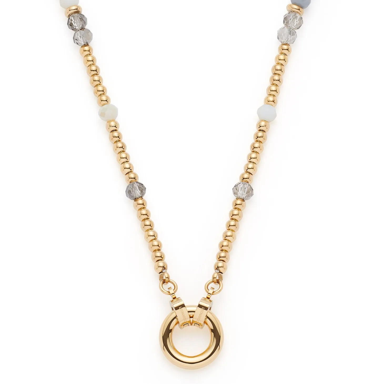 Die Halskette BERNIE vereint zeitlose Eleganz mit modernem Facettenreichtum. Goldene Kugeln und feine Glasschliffperlen in gebrochenem Weiß, mattem Grau und rauchig-transparenten Tönen schaffen ein stilvolles Farbspiel, das Deinen Look perfekt ergänzt. Zwei dezente Clips halten einen schlichten Ring, der Raum für individuelle Gestaltung bietet: Hänge einfach Deine liebsten Clip & Mix Anhänger ein und kreiere Deinen persönlichen Stil. Ob solo getragen oder in Kombination mit dem passenden Armband BERNIE – diese Kette passt sich jedem Anlass und Outfit flexibel an.