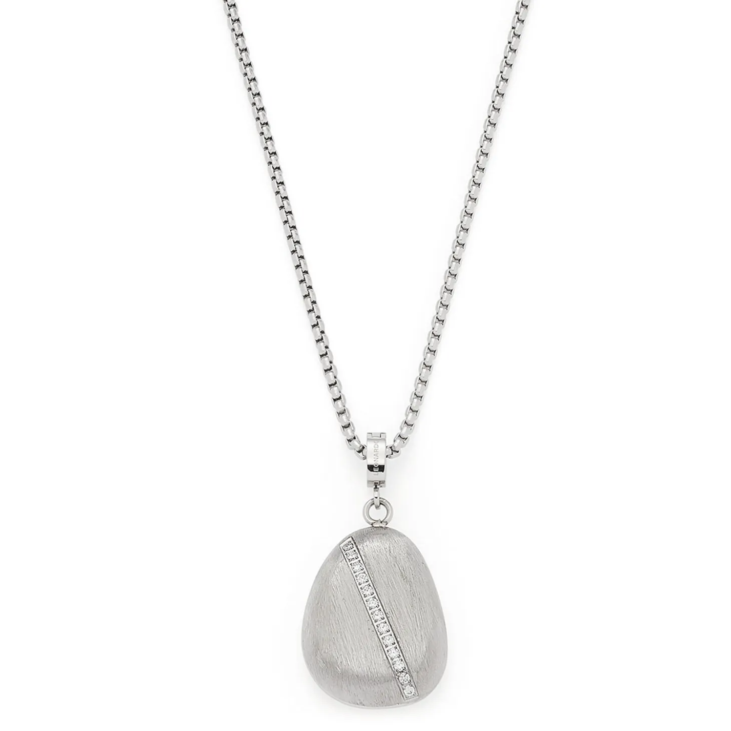 Die lange Venezianerkette aus Edelstahl hat einen Anhänger in ihrem Repertoire, der mit kunstvoller Natürlichkeit für Aufmerksamkeit sorgt. Im Design eines Handschmeichlers besitzt der Clip&Mix-Charm eine organische Form und funkelnde, gefasste Zirkonia-Steinchen, die wie Wassertropfen auf der matt gebürsteten Oberfläche aneinandergereiht sind.