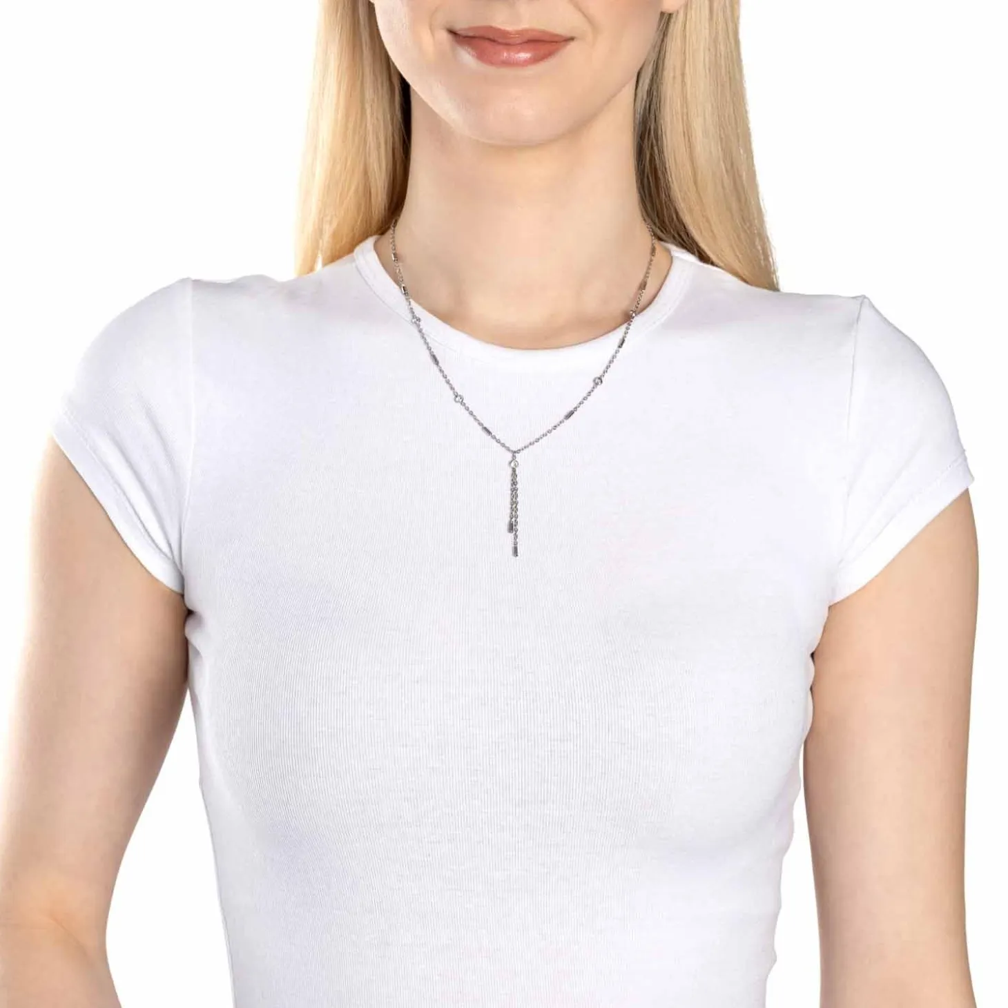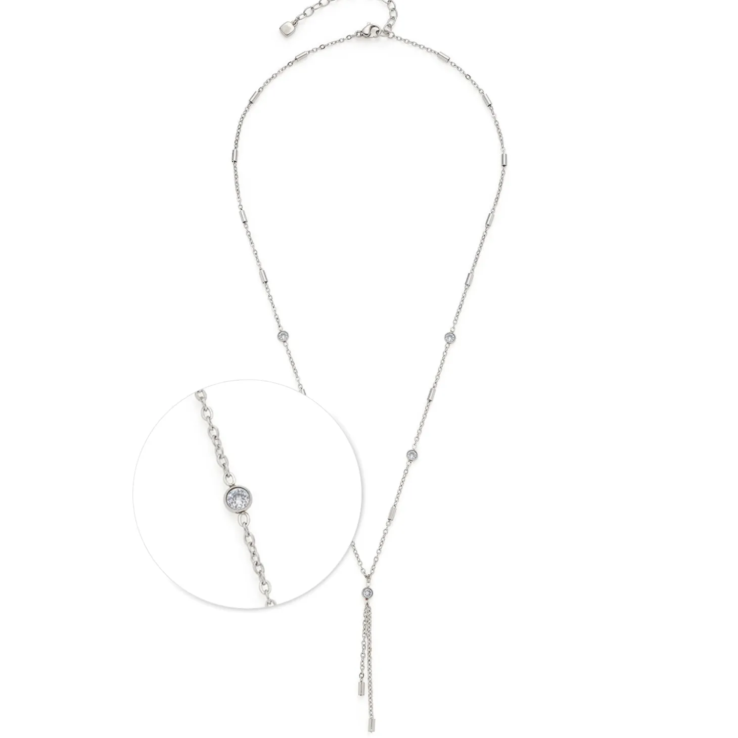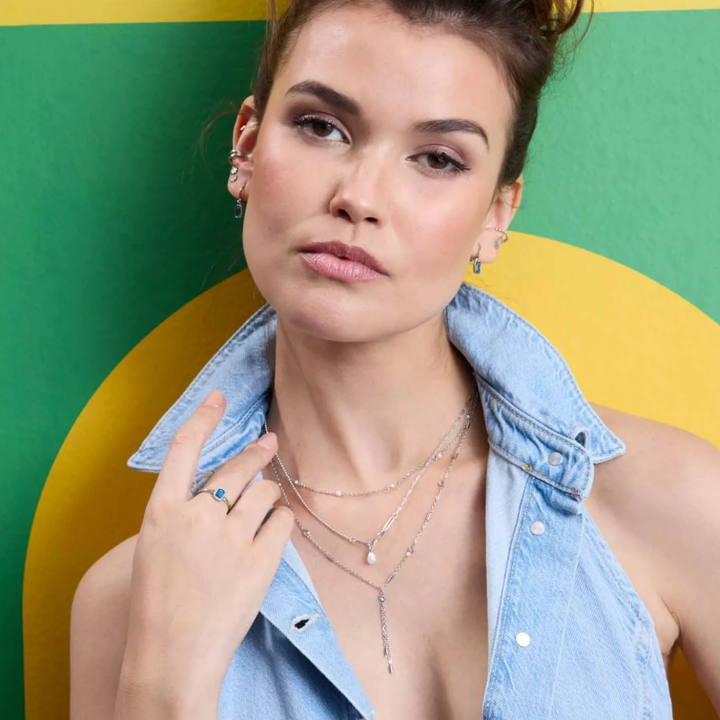 Diese kurze Y-Kette ist ein echter Blickfang! Die feine Ankerkette wird durch kleine, runde Glassteine und Metallstäbchen in regelmäßigen Abständen aufgewertet. Besonders schön ist der vordere Bereich: Hier hängen zwei kurze Kettenstränge an einem runden Glasstein, die sich schön bewegen und der Kette einen entspannten, modernen Look verleihen. Ein perfektes Accessoire, das deinem Outfit eine lässige Note gibt.