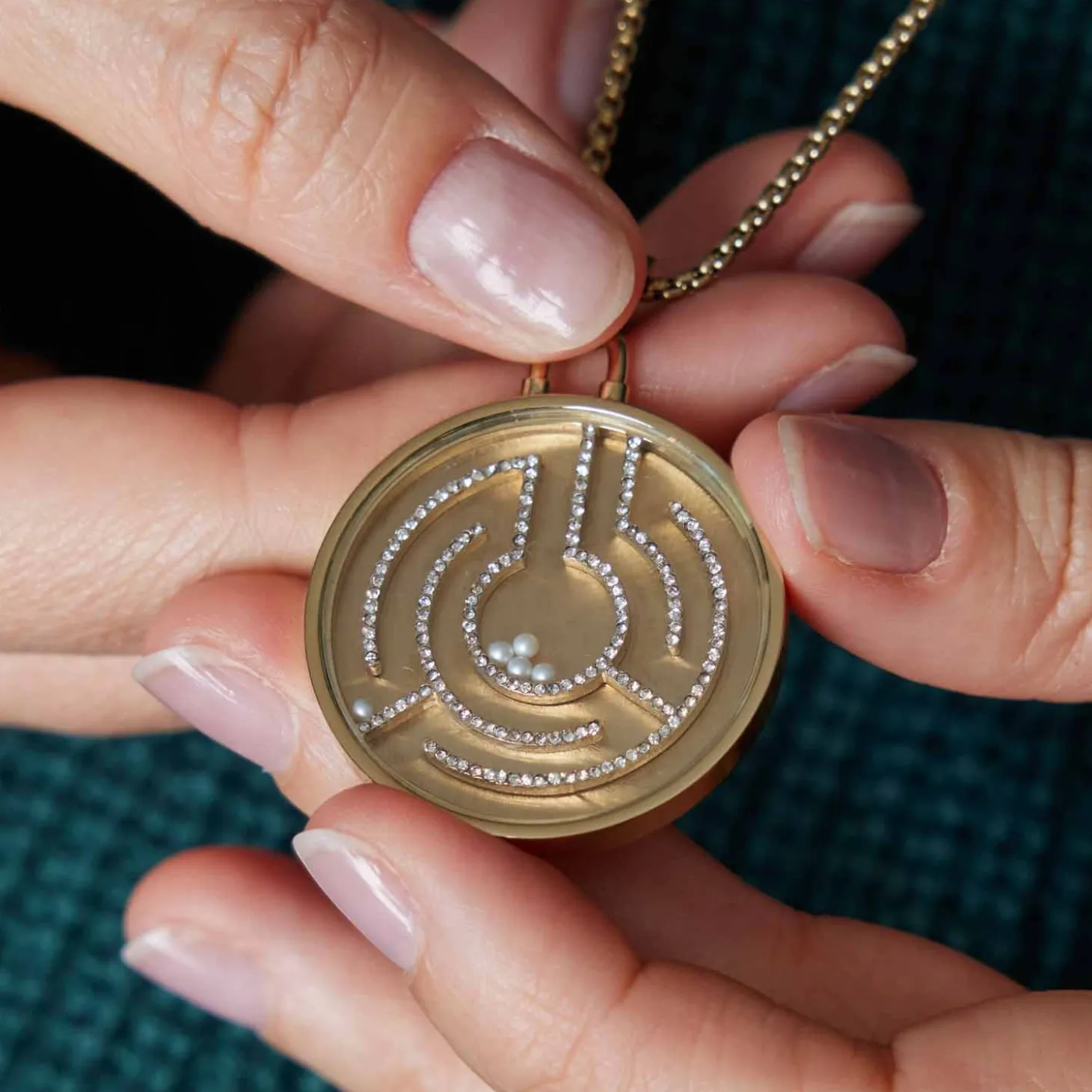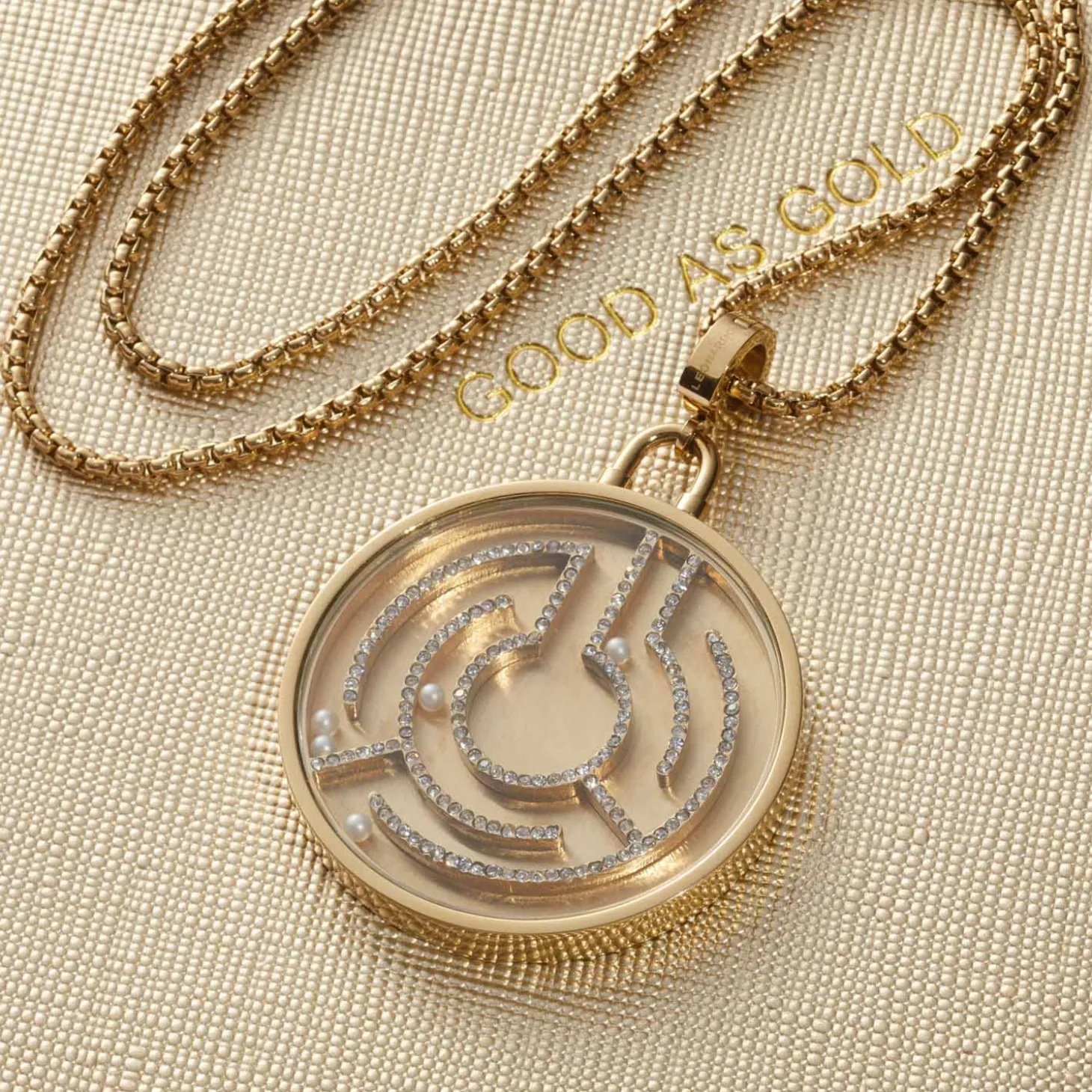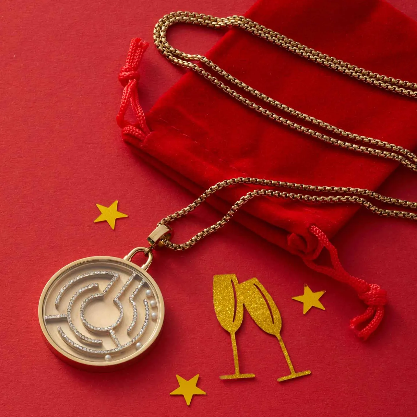 Wenn es um modernes Design, edle Materialien und coole Details geht, liegt die Kette ganz weit vorne. Die lange Ankerkette zeigt sich mit einem großen, runden Anhänger. Dieser begeistert mit einem kleinen Geschicklichkeitsspiel. In dem Anhänger mit Uhrenglas können fünf kleine Perlen durch ein Labyrinth in die Mitte geführt werden. Abgerundet wird der stilvolle Look der Kette mit kleinen, funkelnden Zirkonia Steinchen an den Wänden des Labyrinths. Als Aufhängung dient ein Clip Größe M und schließen lässt sich die Kette dank des Karabinerverschlusses und der Verlängerungskette besonders variabel.