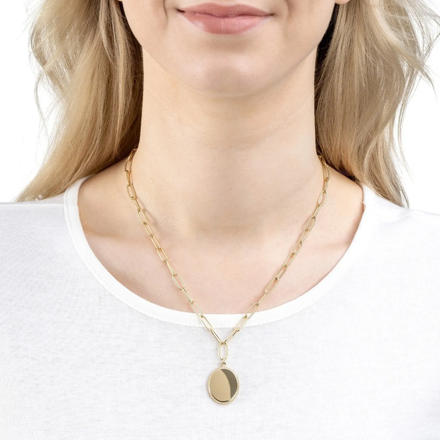 Die kurze Kette besteht aus modernen, fein kordierten Paperclip-Gliedern. Ein ovaler, flächiger Medaillon-Anhänger sorgt für eine kleine Y-Form und verleiht der Kette eine subtile Raffinesse. Der Anhänger selbst begeistert mit einem ziselierten äußeren Rand, der ihm eine zeitlose Eleganz verleiht. Die Vorderseite ist seidenmatt gebürstet, schafft eine weiche Optik und betont das kunstvolle Design.