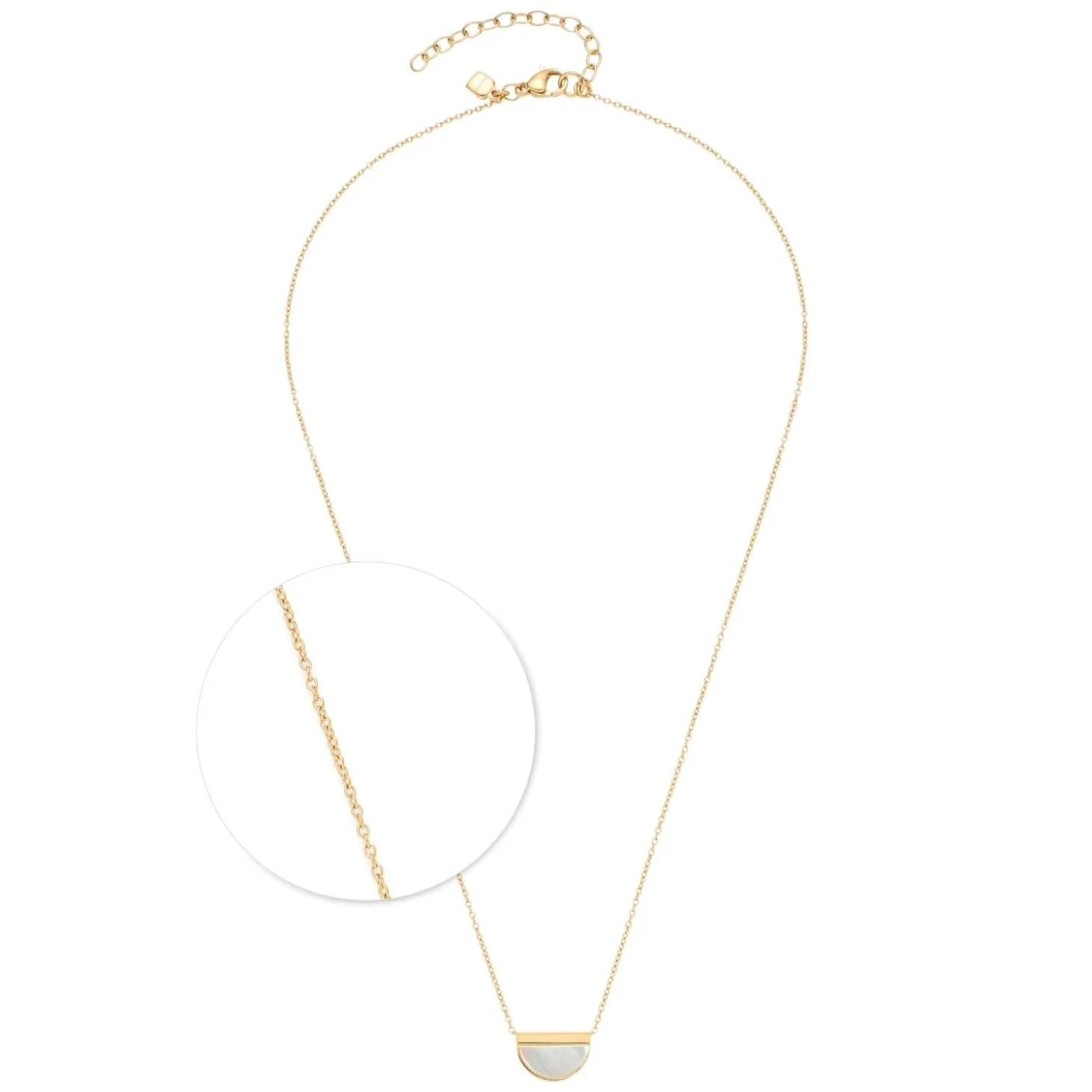 Quer getragene Anhänger, auch Crossways genannt, steigen diese Saison zum absoluten Schmucktrend empor. Dabei lässt sich das halbkreisförmige, flächige Perlmutt-Element auf dem grazil wirkenden Ankerkettchen frei bewegen. Die halsnahe Edelstahl-Kette mit goldener Ionenplattierung schließt mit Karabinerverschluss und Verlängerungskettchen, der Anhänger kann auf der Rückseite mit einer personalisierten Gravur versehen werden.