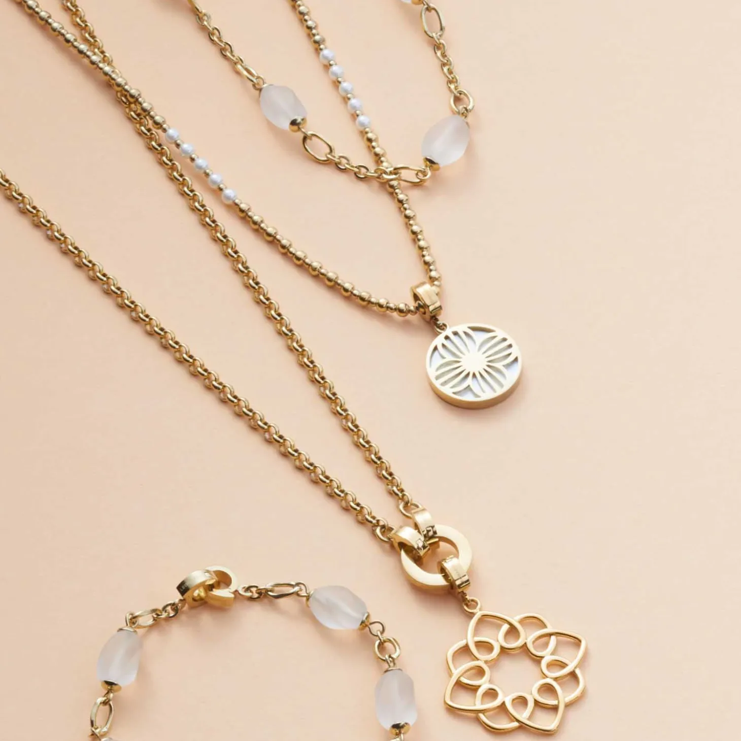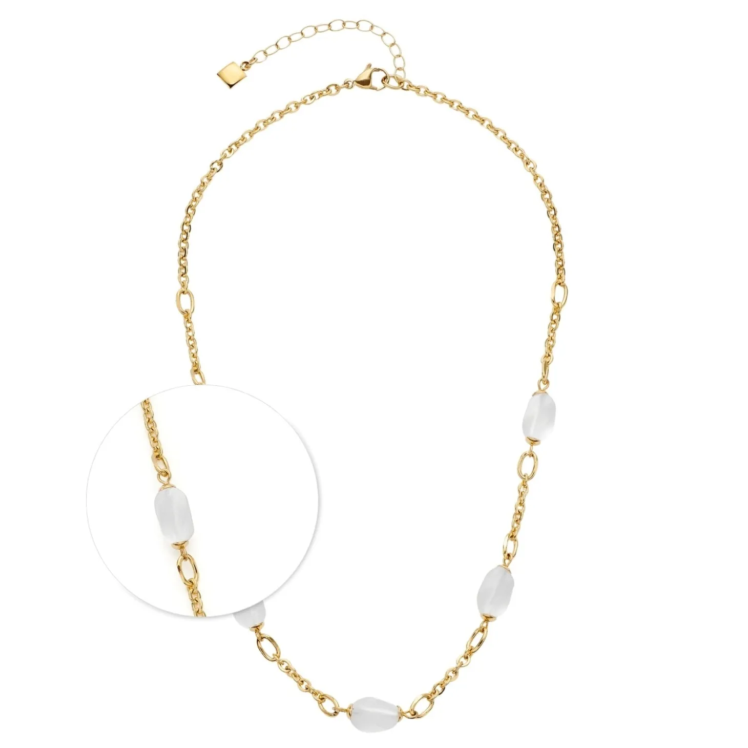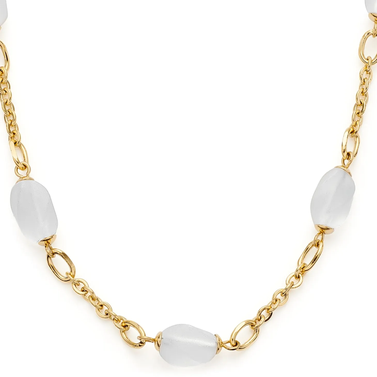 Dem Bergkristall wird nachgesagt, für Klarheit und Vitalität zu sorgen. Noch dazu erfreut er sich dank seines faszinierend durchsichtigen Erscheinungsbildes großer Beleibtheit. Bei diesem modernen Schmuckstück mit goldener Ionen-Plattierung sind matt schimmernde, satinierte und unregelmäßig geformte Bergkristall-Perlen in gewissen Abständen innerhalb der Ankerkette der Hingucker.