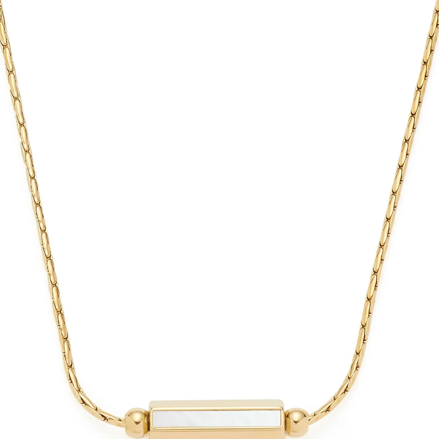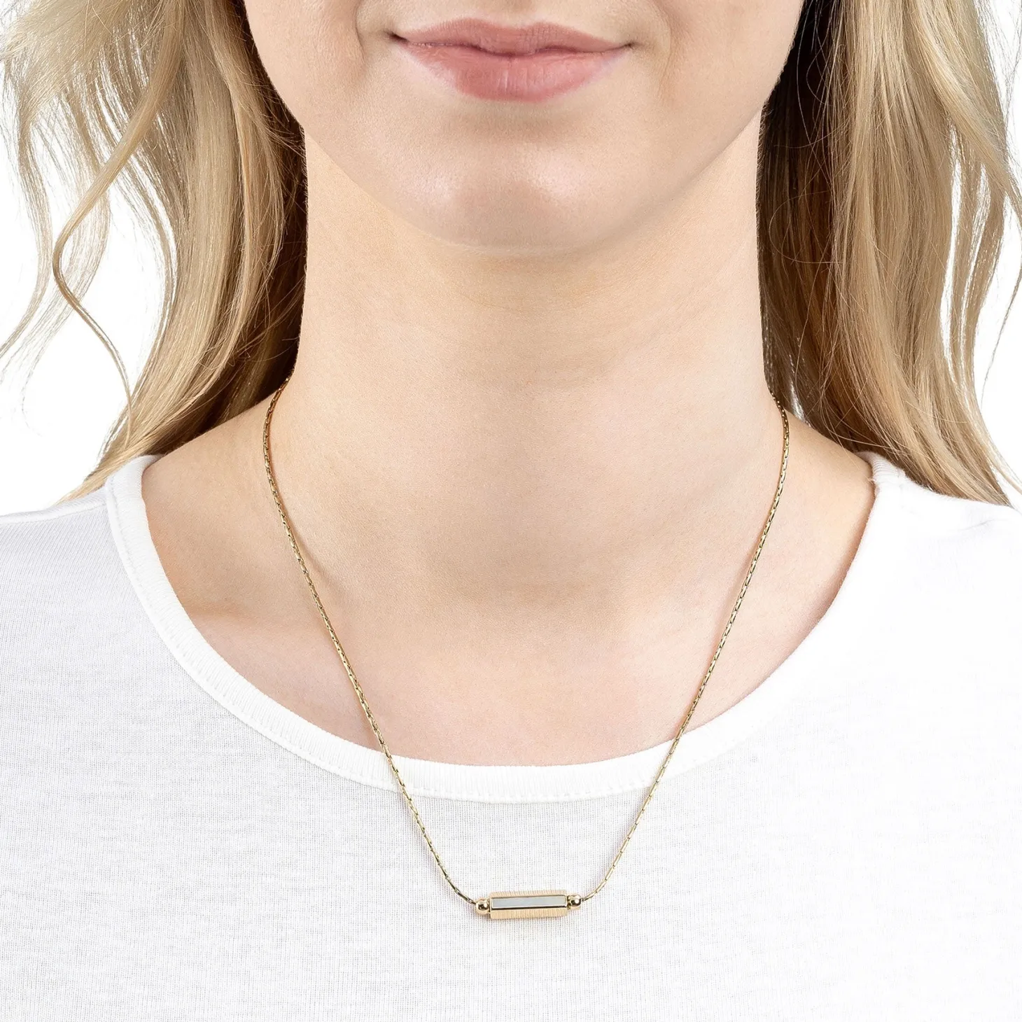 Die zarte und anschmiegsame Rundankerkette präsentiert sich als zeitlos elegantes Accessoire. Das Highlight befindet sich im Dekolleté-Bereich, wo eine frei bewegliche Zylinder-Perle im Hexagon-Profil als Anhänger fungiert. Diese Perle ist auf zwei Seiten mit weißem Perlmutt verziert, während eine Seite unterhalb der Perlmuttfläche Raum für eine individuelle Gravur bietet. Neben dem Zylinder sind runde Edelstahlperlen fixiert, die einen sanften Übergang zur Kette schaffen. Dieses Schmuckstück vereint modernes Crossways-Design mit persönlicher Gestaltungsfreiheit.