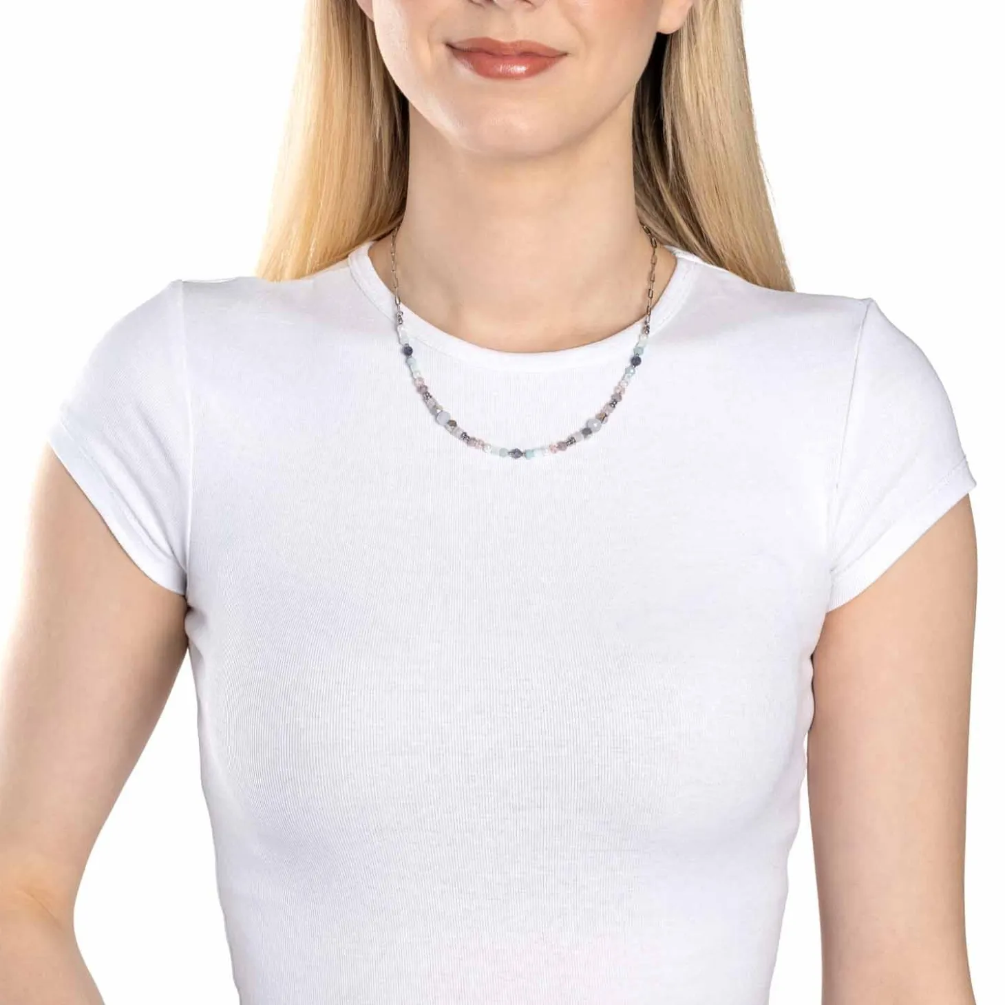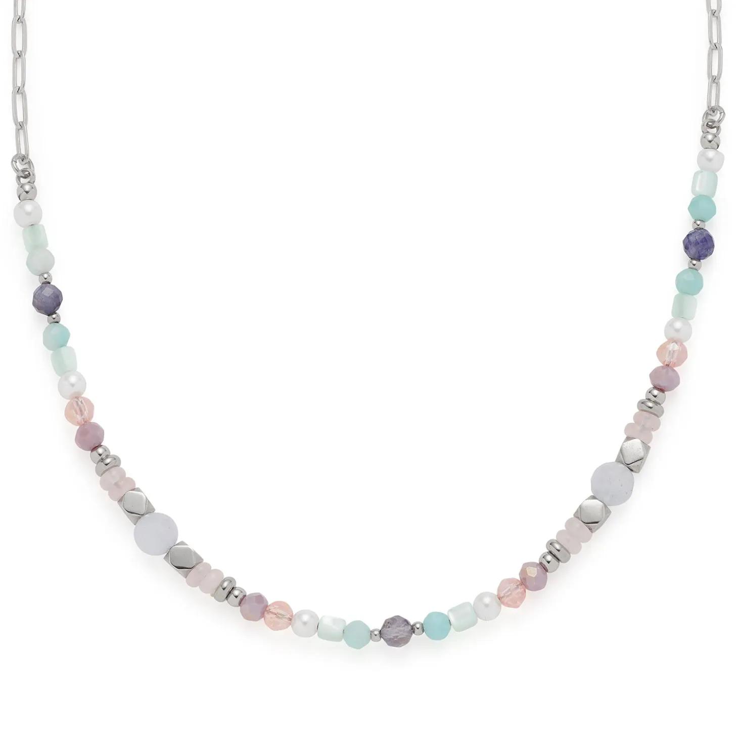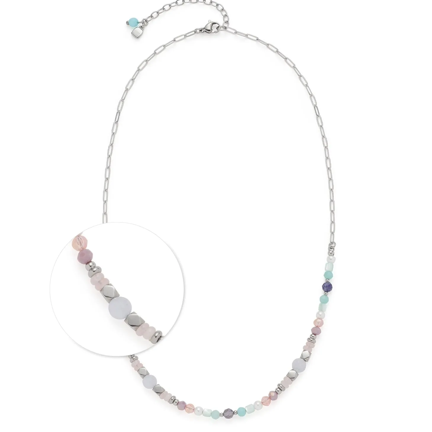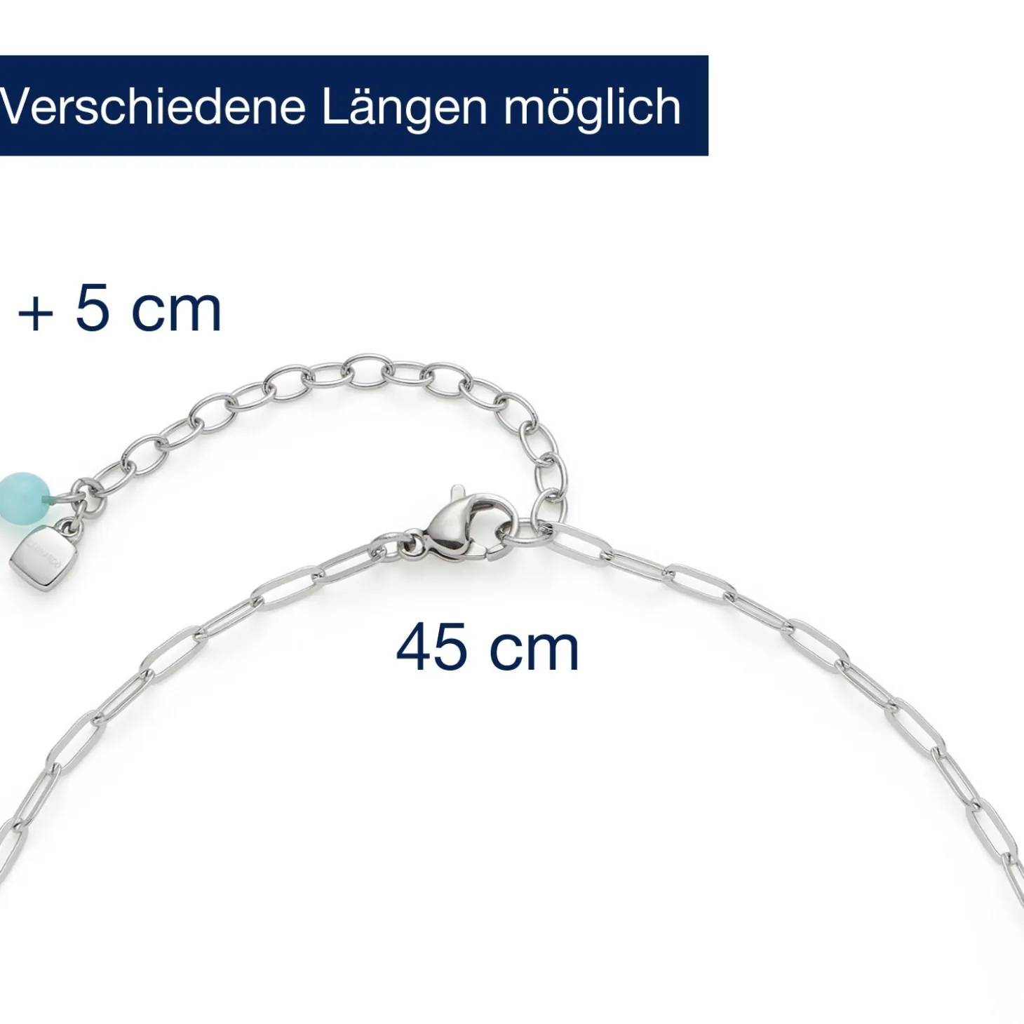 Kühle Töne gepaart mit filigranen Elementen – diese Kette begeistert durch einen besonders charmanten Mix. Perlen in verschiedenen Formen und Pastelltönen bringen sich hier in den Fokus und werden modern interpretiert. Dieses zeitlose Modell ermöglicht ein vielseitiges Styling, während die besonderen Details wie die Paperclip-Kette eine trendbewusste Note hinzufügen.
