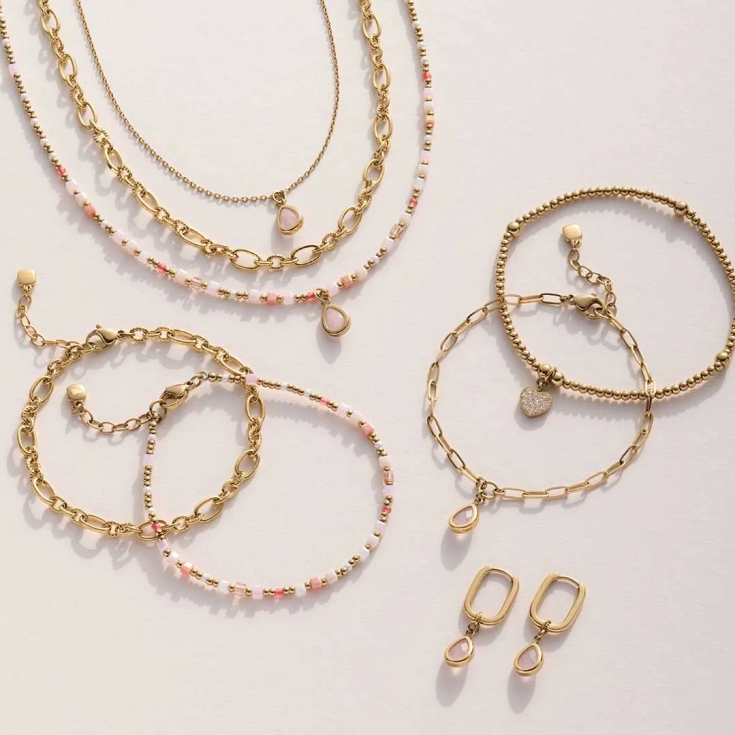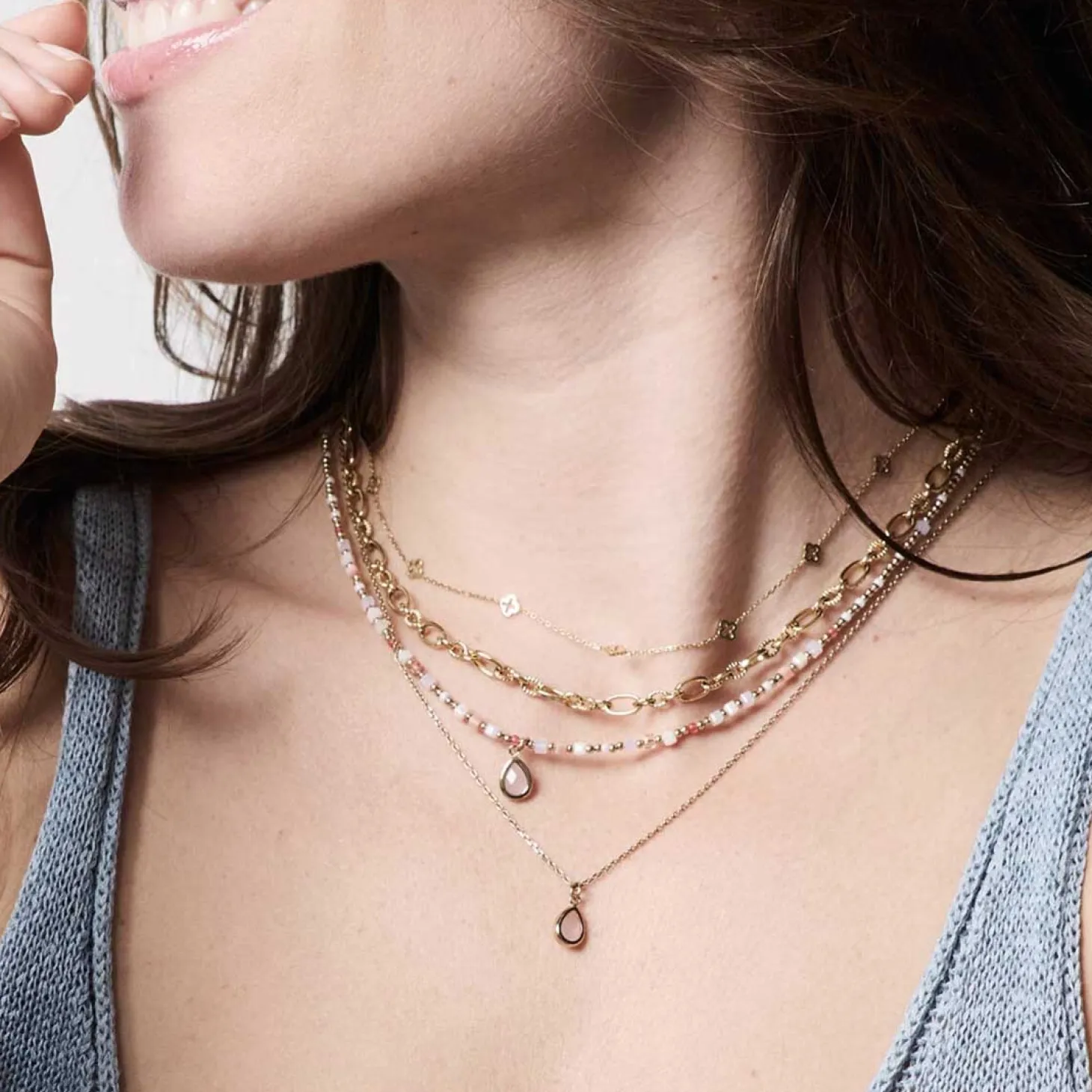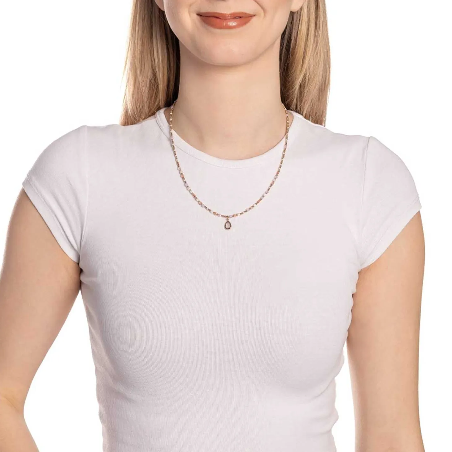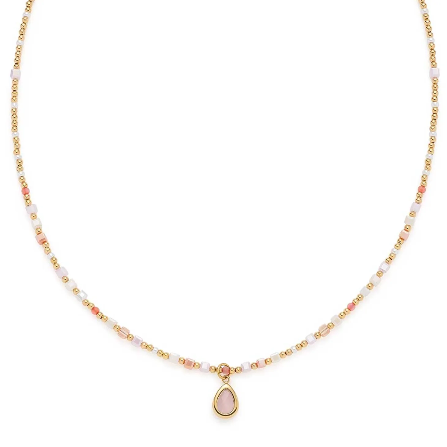 Die Halskette SHARI fängt den zarten Romantic-Trend perfekt ein und verleiht jedem Look eine sommerlich-leichte Note. Die kurze Kette aus poliertem Edelstahl mit goldfarbener Veredelung kombiniert kleine Goldkugeln, Perlen in Pastellrosa, Weiß und Apricot sowie natürlich wirkende weiße Perlen zu einem harmonischen Farbspiel. Im Mittelpunkt steht ein facettierter Glastropfen in zartem Rosé, eingefasst in einen schmalen Goldrahmen – ein eleganter Blickfang, der Licht wunderschön reflektiert. Winzige Akzente in Orange verleihen dem Design eine frische, lebendige Ausstrahlung. Mit Karabinerverschluss und Verlängerungskette lässt sich die Länge individuell anpassen. Die Halskette SHARI ist ein idealer Begleiter für den Alltag oder besondere Anlässe – dezent, modern und voller Leichtigkeit.