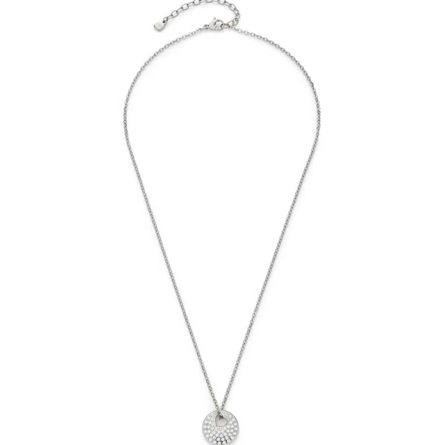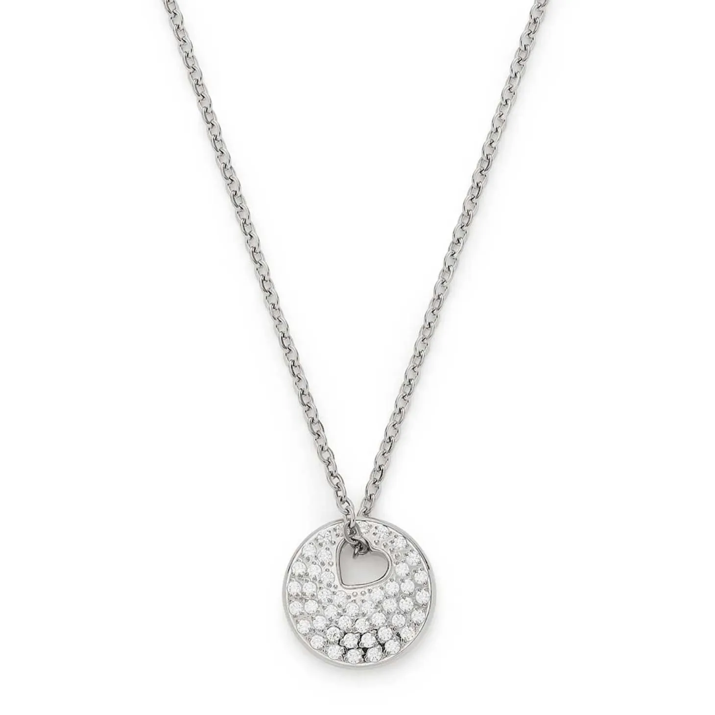 Die Halskette SUE AMOUR vereint funkelnde Raffinesse mit moderner Symbolkraft. Die kurze, geschliffene Weitankerkette aus poliertem Edelstahl trägt einen runden Anhänger, der an eine feine Münze erinnert und auf der Vorderseite mit strahlenden Zirkonia-Steinen im Pavé-Stil besetzt ist. Ein besonderes Highlight: Die Kette wird nicht über eine klassische Öse geführt, sondern durch ein herzförmiges Loch im Anhänger, das ihr Design einzigartig macht. Der harmonische Mix aus klarer Form und feinem Glanz verleiht diesem Schmuckstück seinen modernen, femininen Look. Die Halskette SUE AMOUR lässt sich vielseitig tragen – ob im Alltag oder als liebevolles Geschenk mit Bedeutung.