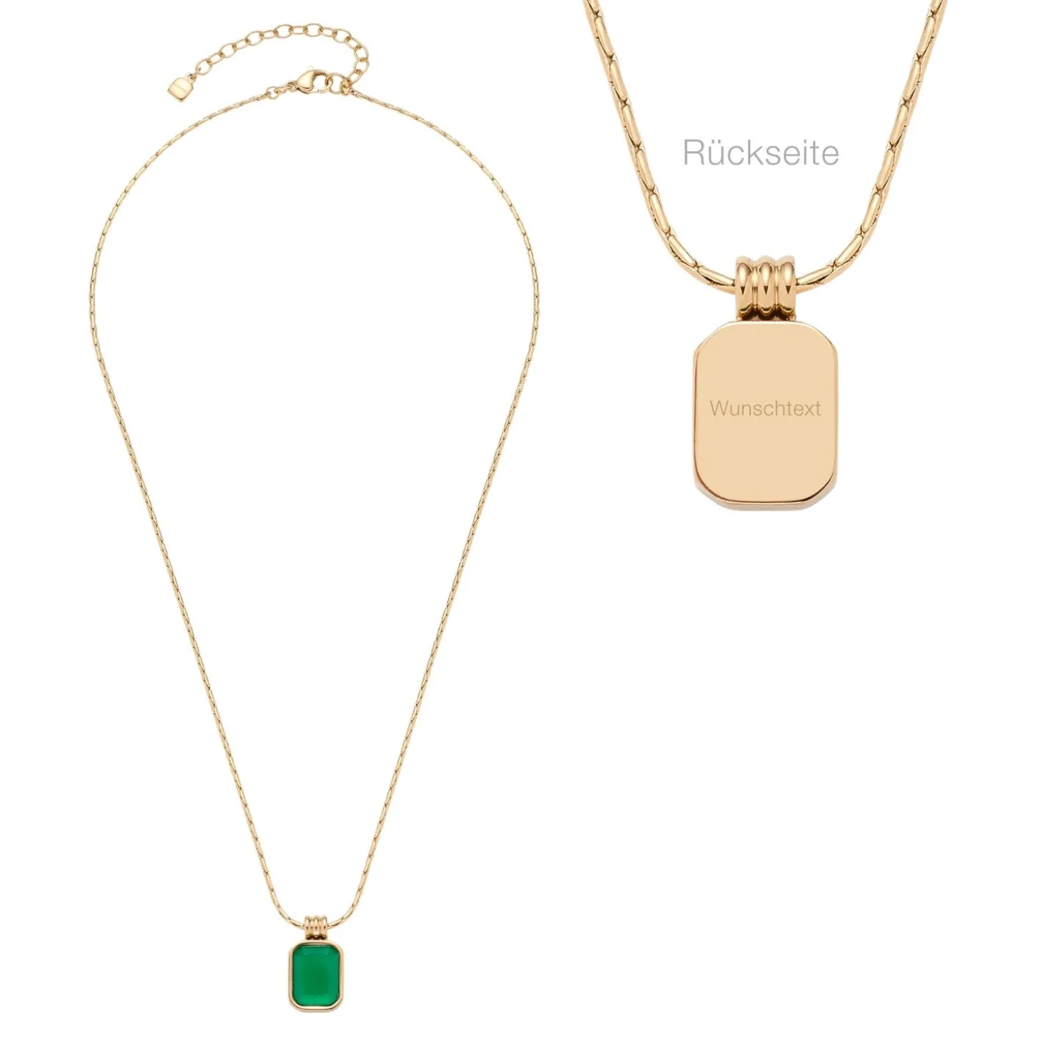 Massiv, opulent, Modetrend: Diese Saison setzen Schmuckstücke auf elegante Grün-Gold-Optiken und geradlinige Baguette-Formen. Die feine Venezianer-Inka-Kette mit Karabinerverschluss und Verlängerungskettchen ist mit einem unübersehbar luxuriös wirkenden Anhänger ausstaffiert. In seiner golden ionenplattierten Edelstahl-Fassung sitzt ein smaragdgrünes Glaskristall-Baguette, die geschlossene Rückseite der Fassung kann mit einer Gravur zusätzlich veredelt werden.