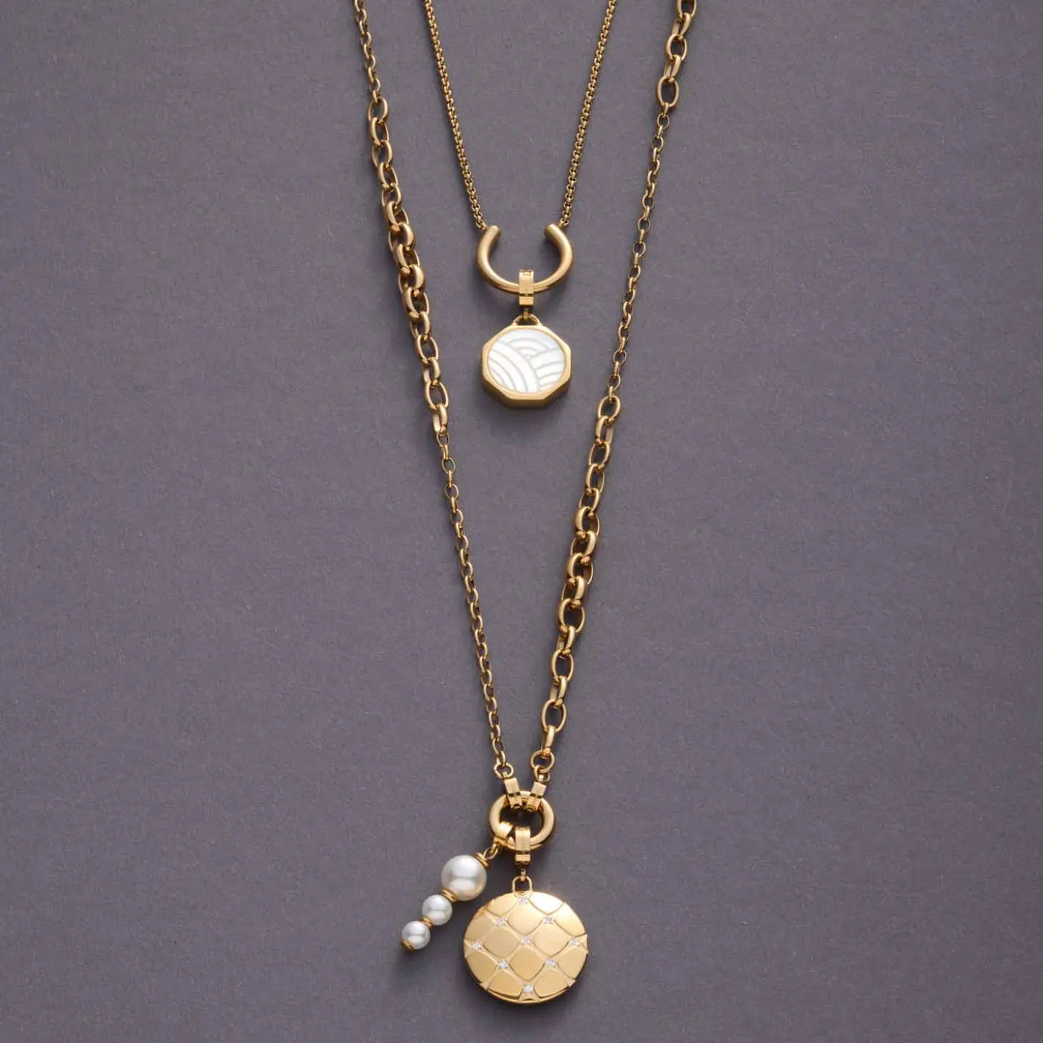 Die Halskette SUZANNE in Goldoptik interpretiert klassische Eleganz neu: Ovale Kettenglieder im Größenverlauf kombiniert mit feinen Weitankerelementen machen dieses Schmuckstück zum stilvollen Highlight. Mit den beiden Clips kannst Du Deinen Look jederzeit verändern und den schlichten Ring mit Deinen LieblingsAnhängern schmücken. Ein ausdrucksstarkes Accessoire, das sowohl solo getragen als auch im kreativen Mix begeistert.