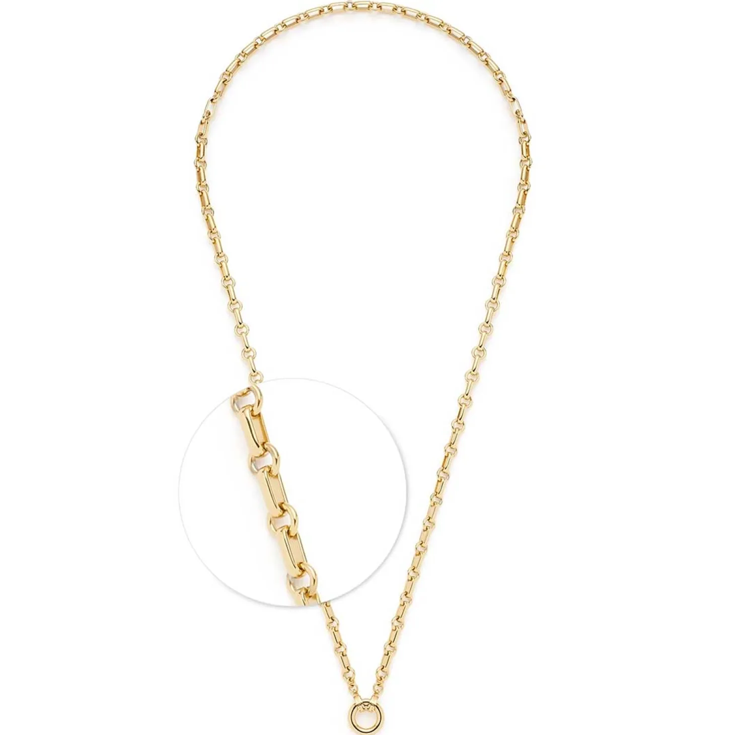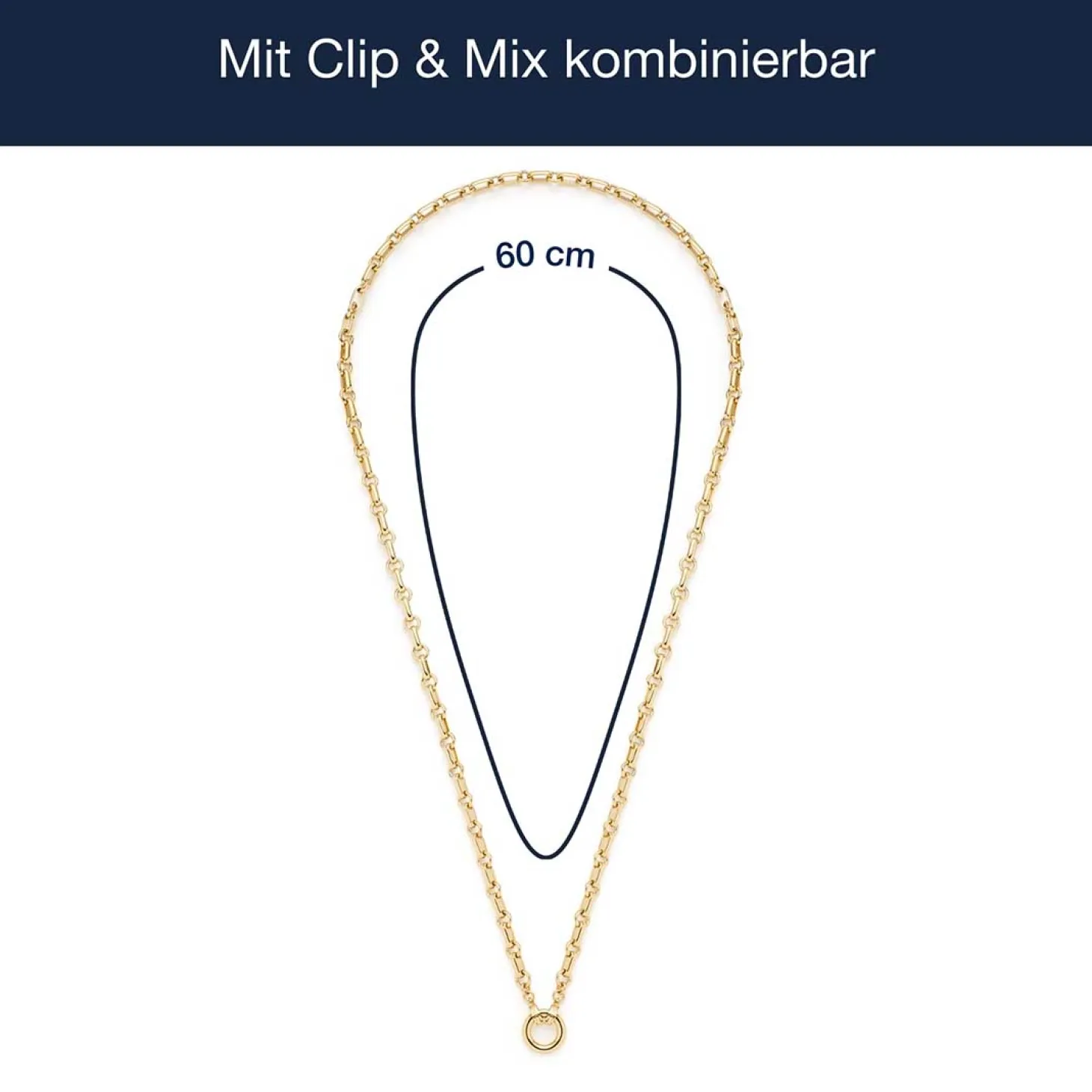 Die Kette YVETTE vereint klaren Stil mit edlem Glanz und modernen Formen. Sie besteht aus abwechselnd länglich-ovalen und runden Kettengliedern, die dem Design Tiefe und Struktur verleihen. Der schlichte, polierte Edelstahlring mit goldfarbener Ionenplattierung bildet den Mittelpunkt der Kette und kann dank der Clip&Mix-Funktion individuell mit einem oder mehreren Anhängern kombiniert werden. So kannst du die Kette jederzeit an deinen persönlichen Stil anpassen – ob dezent im Alltag oder auffällig mit einem Clip für besondere Anlässe. Der hochwertige Edelstahl sorgt für langlebige Qualität und angenehmen Tragekomfort. Die Kette YVETTE ist ein echtes Styling-Must-have mit endlosen Kombinationsmöglichkeiten.
