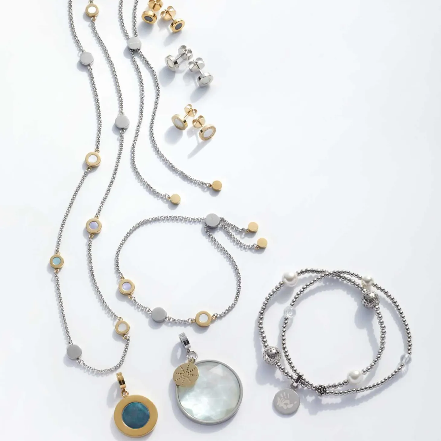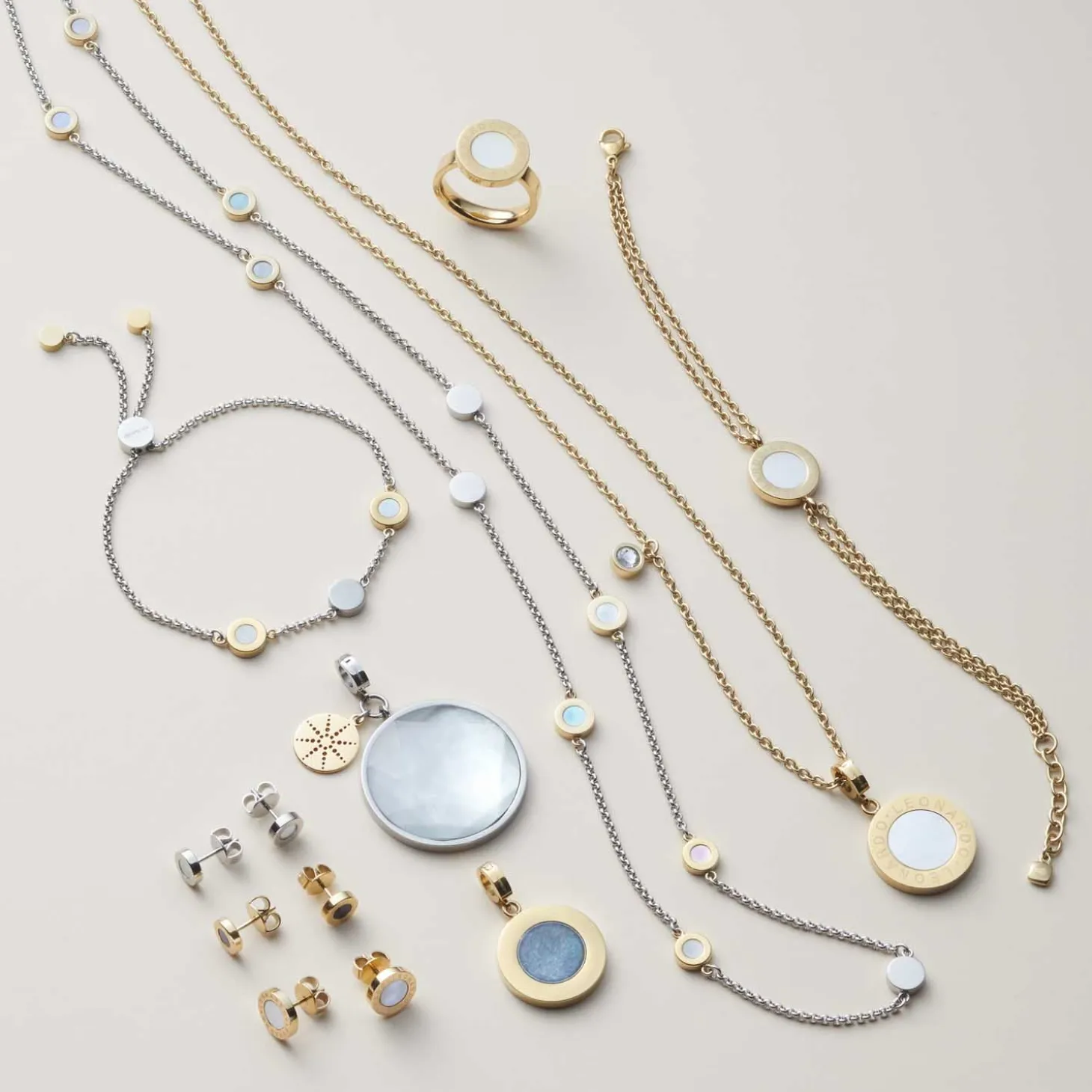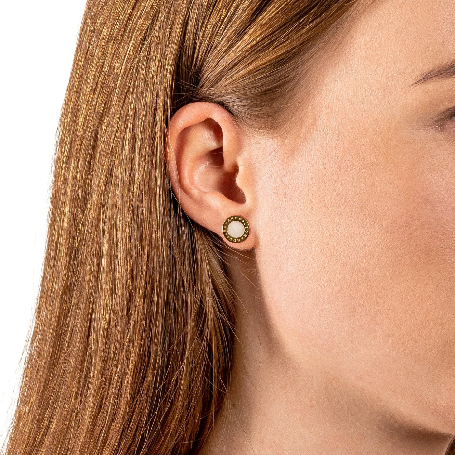 Stilvoll treten die Ohrstecker aus goldfarben ionenplattiertem Edelstahl in Erscheinung. Um die eingelassene Scheibe aus schimmerndem Perlmutt ist ein LEONARDO-Schriftzug eingraviert.
