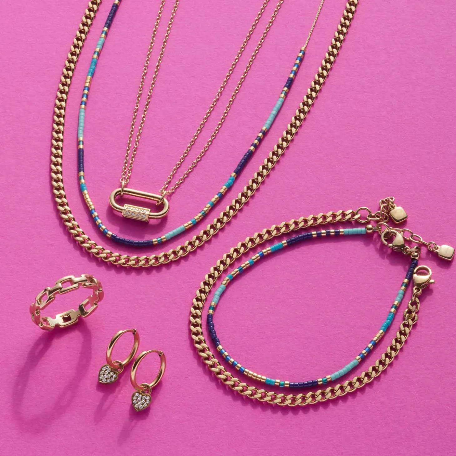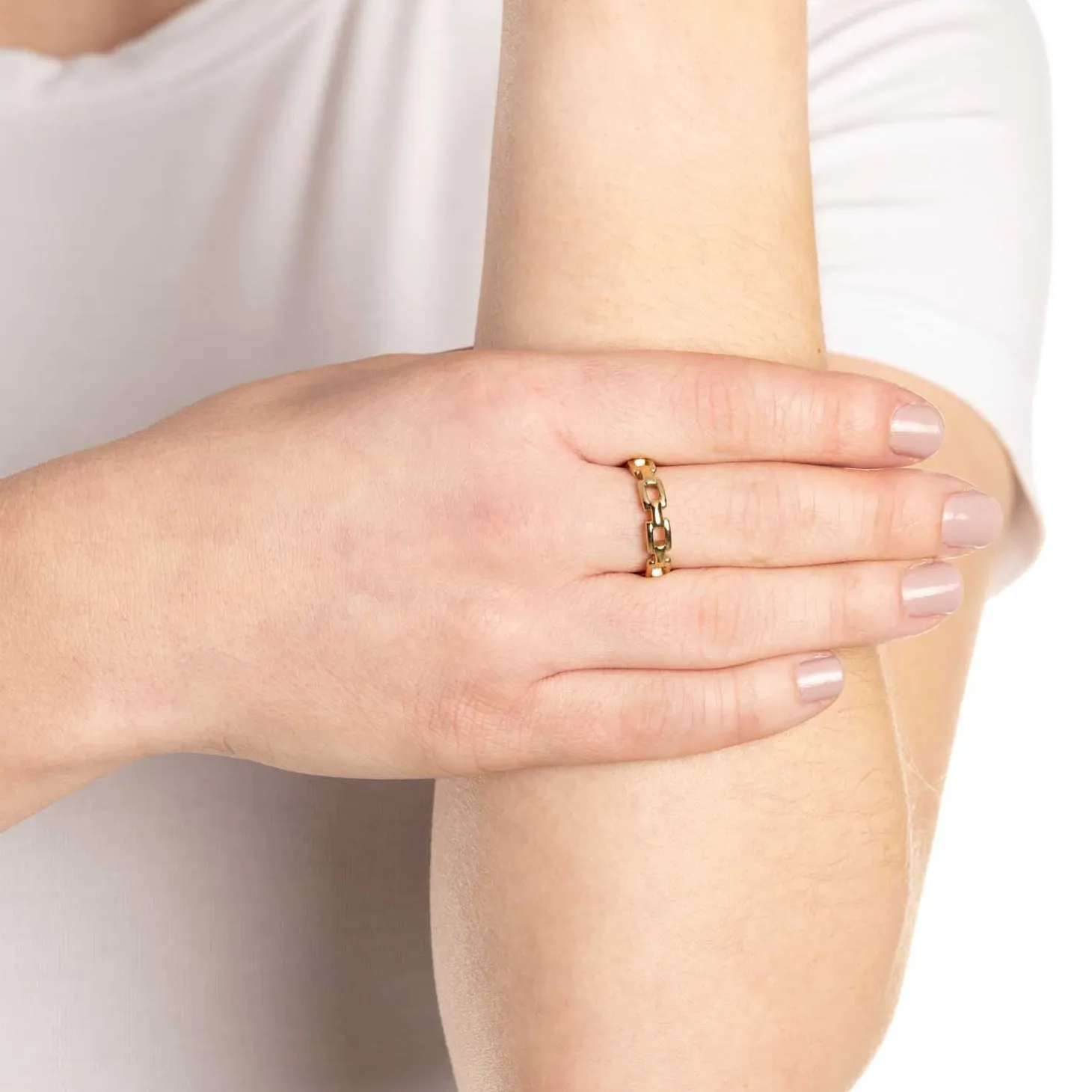 Ineinandergesetzte, rechteckige Kettenglieder ergeben diesen schmalen Bandring aus golden ionenplattiertem Edelstahl. Das Design verkörpert schlichte Eleganz und unterstreicht schicke Sommer-Looks mit dem gewissen Etwas.