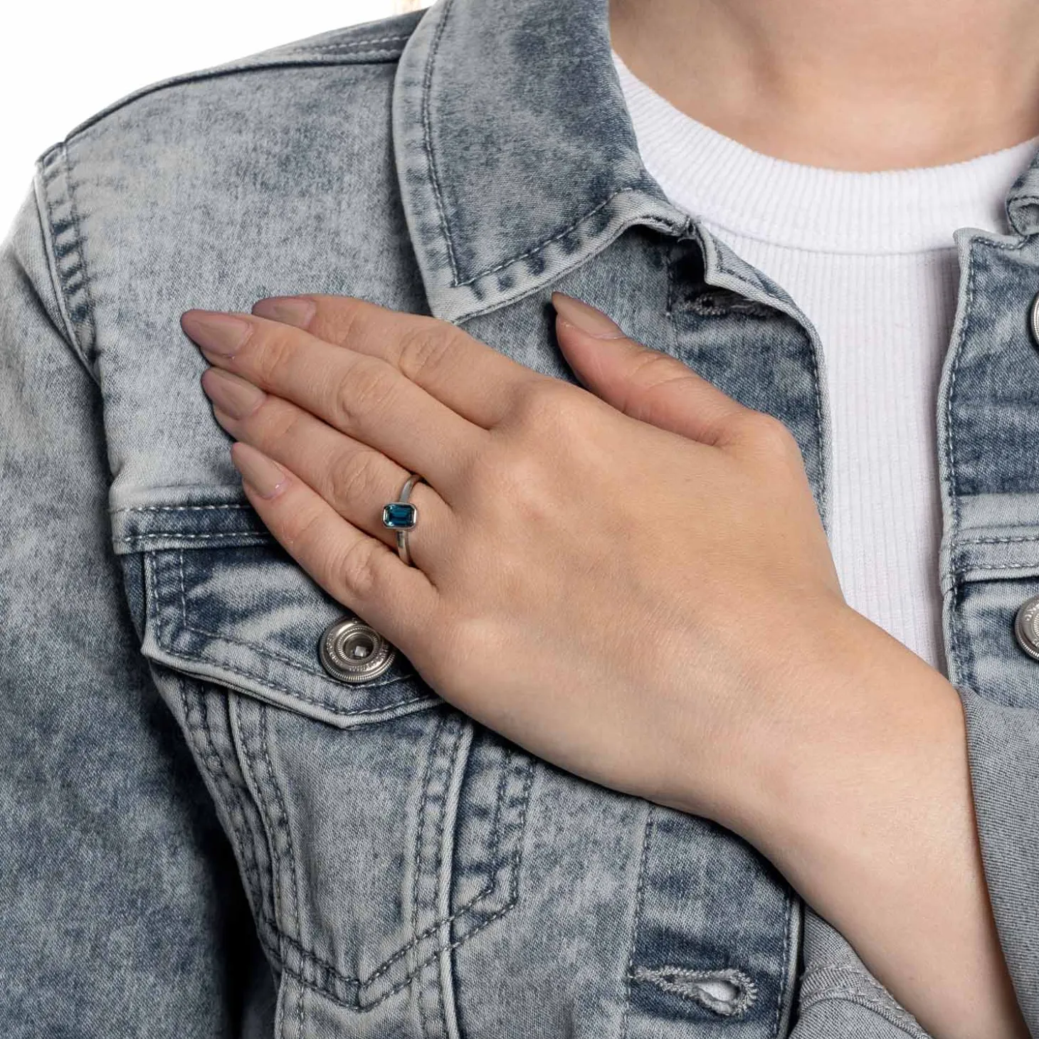 Dieser Ring zeigt sich als zeitloses Essential für jeden Tag. Seine zarte, schlichte Optik wird mit einem blauen Baguette Stein in Längsrichtung stilvoll aufgelockert. Kombiniert werden kann er zum Beispiel mühelos mit dem Set Sophia. Aber auch für das beliebte Ring-Stacking eignet er sich hervorragend – vor allem andere Silber-Schmuckstücke sind da gefragt.
