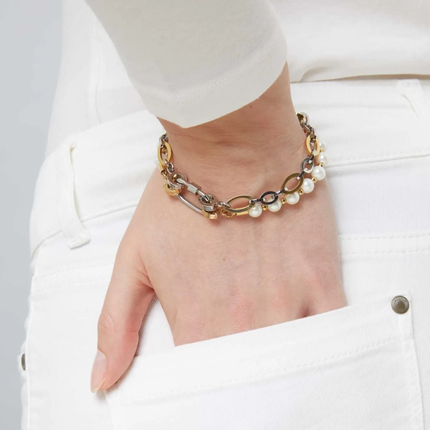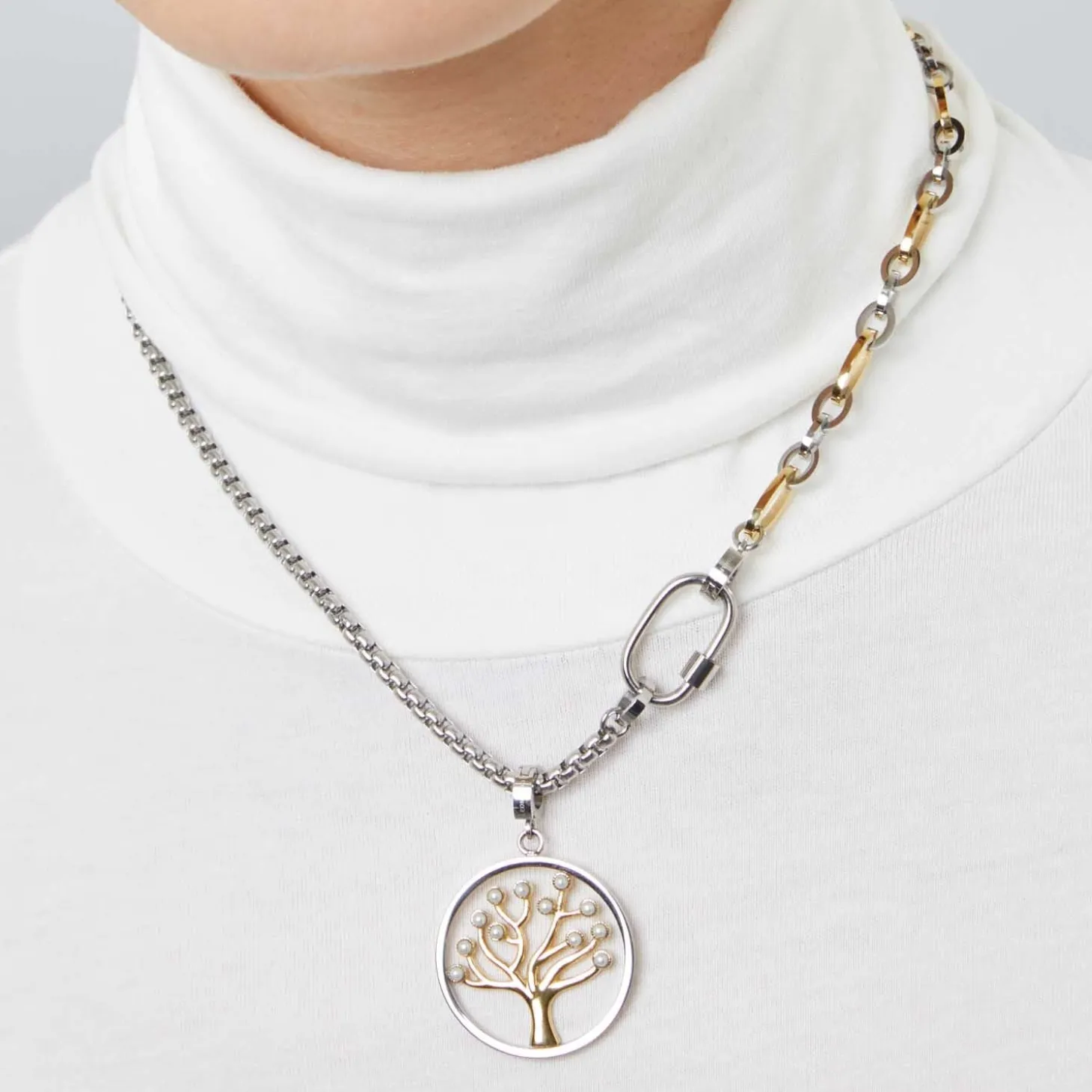 Die nostalgische Perlen-Halskette erfährt in diesem modernen Schmuckstück, bestehend aus zwei Armbändern und einer Verlängerung, eine extravagante Neuinterpretation. Dabei werden bei einem Armband Imitationsperlen im Mix mit goldenen Edelstahlkügelchen kombiniert, das andere Armband, bestehend aus Kettengliedern in bicolor, bricht auf stylishe Art und Weise die zurückhaltende Optik des Perlenlooks auf. Eine schlichte Verlängerungskette rundet den MIx ab. Der Lebensbaum mit kleinen Cabochons aus Imitationsperlen, als eines der beliebtesten Symbol-Motive, findet sich als runder Anhänger an einem Drehschloss wieder.