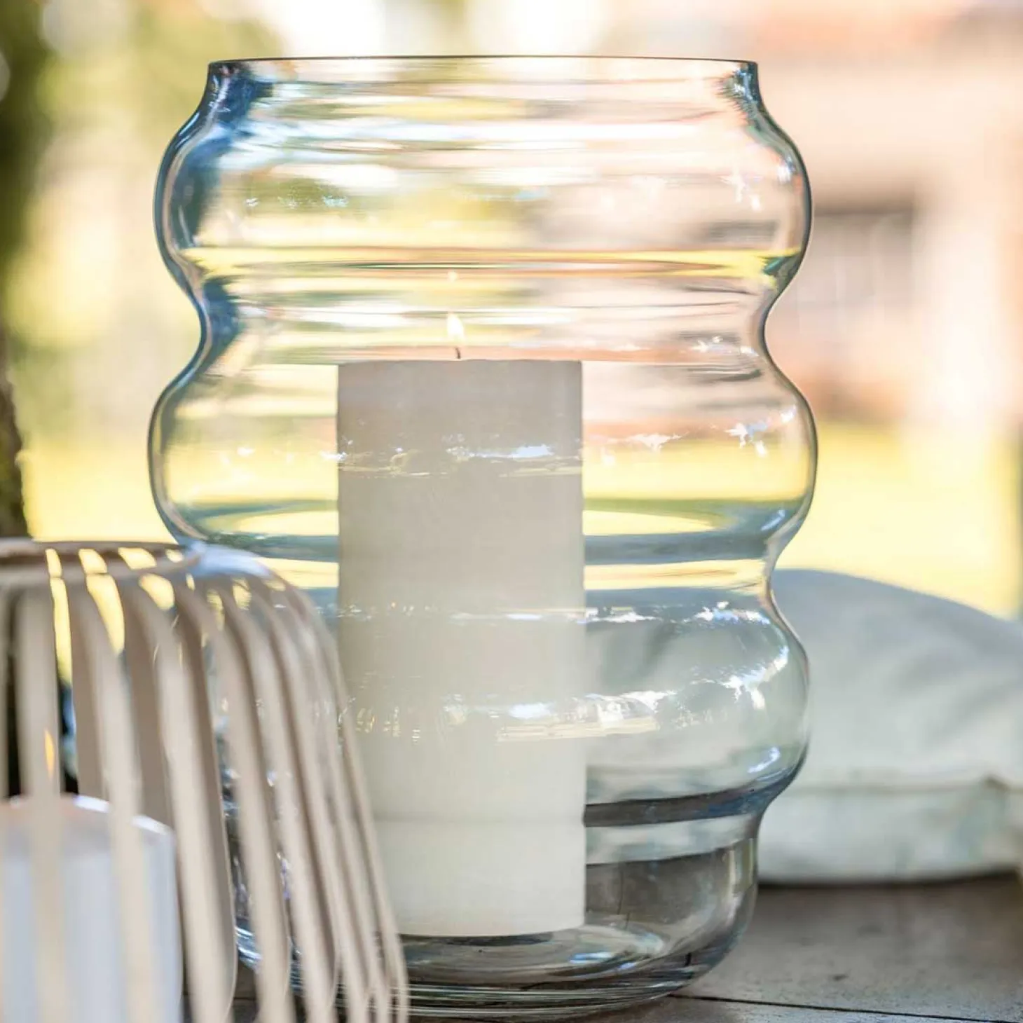 Stell dir vor, wie dein Zuhause in sanftes, warmes Licht getaucht wird – das Windlicht SOLE sorgt genau dafür! Mit seiner außergewöhnlichen, gewellten Form ist es nicht nur eine Lichtquelle, sondern auch ein echter Hingucker. Die große, elegante Form zieht alle Blicke auf sich und setzt in jedem Raum stilvolle Akzente. Ob auf dem Flur, im Wohnzimmer oder draußen auf der Terrasse – SOLE verleiht deiner Umgebung das gewisse Etwas. Das besondere Design sorgt dafür, dass das Licht auf faszinierende Weise gebrochen wird und eine gemütliche, einladende Atmosphäre entsteht. Mach dein Zuhause noch schöner mit dem Windlicht SOLE!