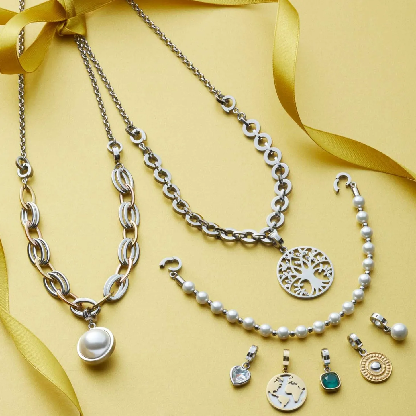 Zu den Symbol-Klassikern zählt auf jeden Fall der Lebensbaum. Der durchbrochene Edelstahl-Anhänger mit bedeutsamer Aussagekraft ist im Bereich seiner Blätter mit winzigen Glaskristallen verziert. Für ein strahlendes Dekolleté!
