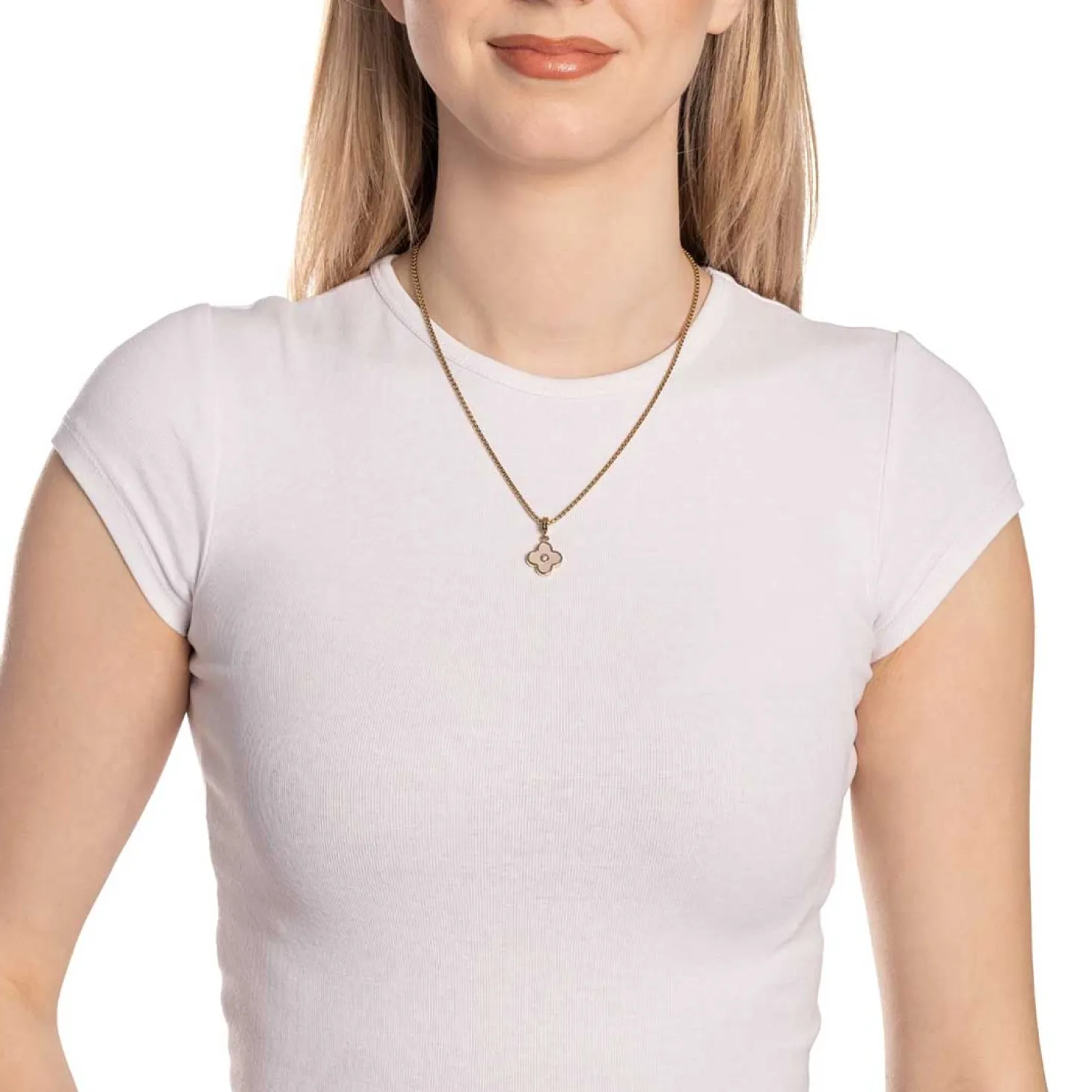 Der Anhänger BLUNA ist ein zartes Schmuckstück mit symbolischer Bedeutung. Der kleine, goldfarbene Anhänger aus poliertem Edelstahl mit goldener Ionenplattierung zeigt ein vierblättriges Kleeblatt, das für Glück und positive Energie steht. Eine feine Perlmutt-Einlage verleiht der Oberfläche einen sanften Schimmer, während ein Zirkonia-Stein in der Mitte elegant funkelt. Das Zusammenspiel aus Goldglanz, Perlmuttschimmer und funkelndem Stein macht BLUNA zu einem edlen Begleiter für Alltag und besondere Anlässe. Mit dem Clip in Größe S lässt sich der Anhänger flexibel an passenden Basis-Ketten oder -Armbändern befestigen und kombinieren.