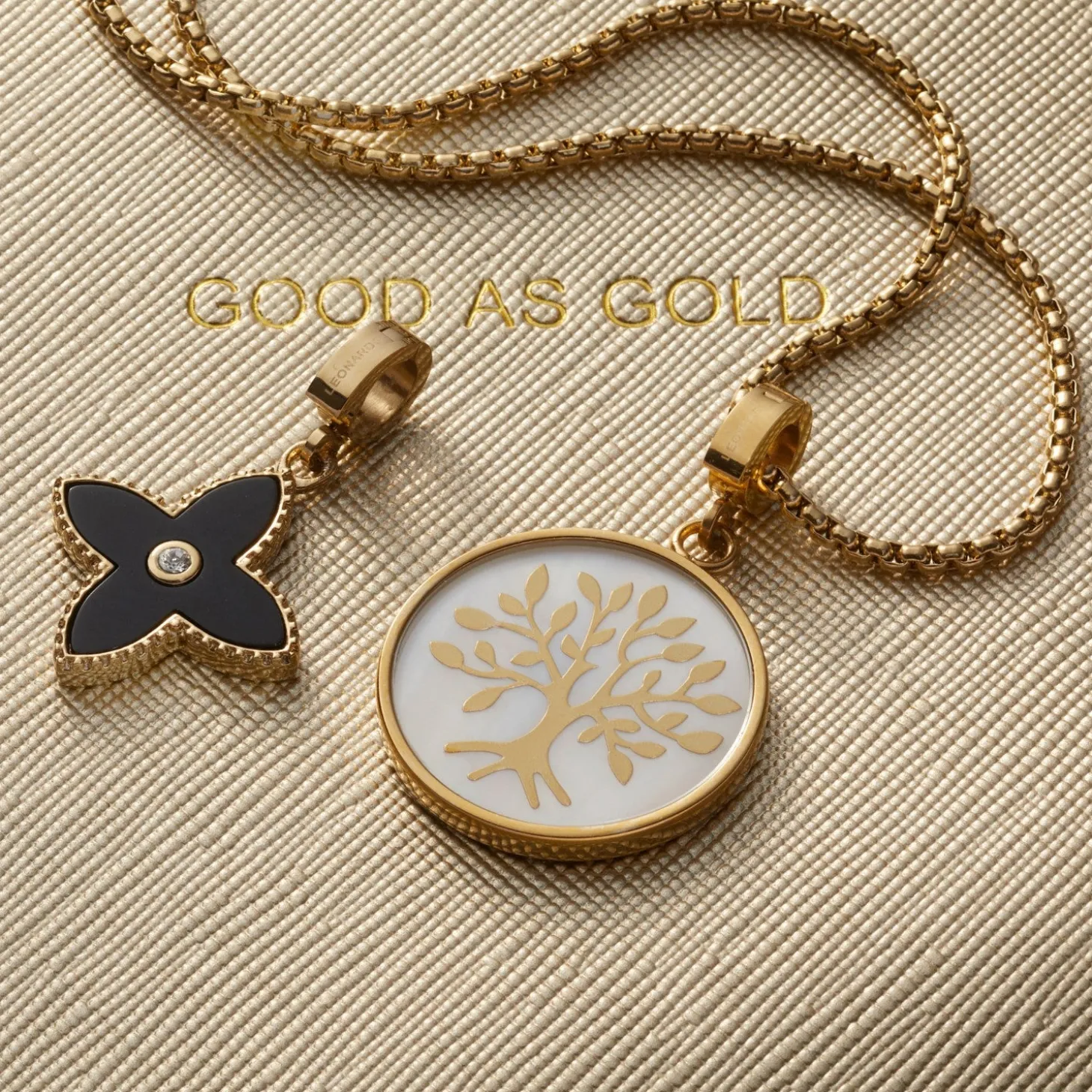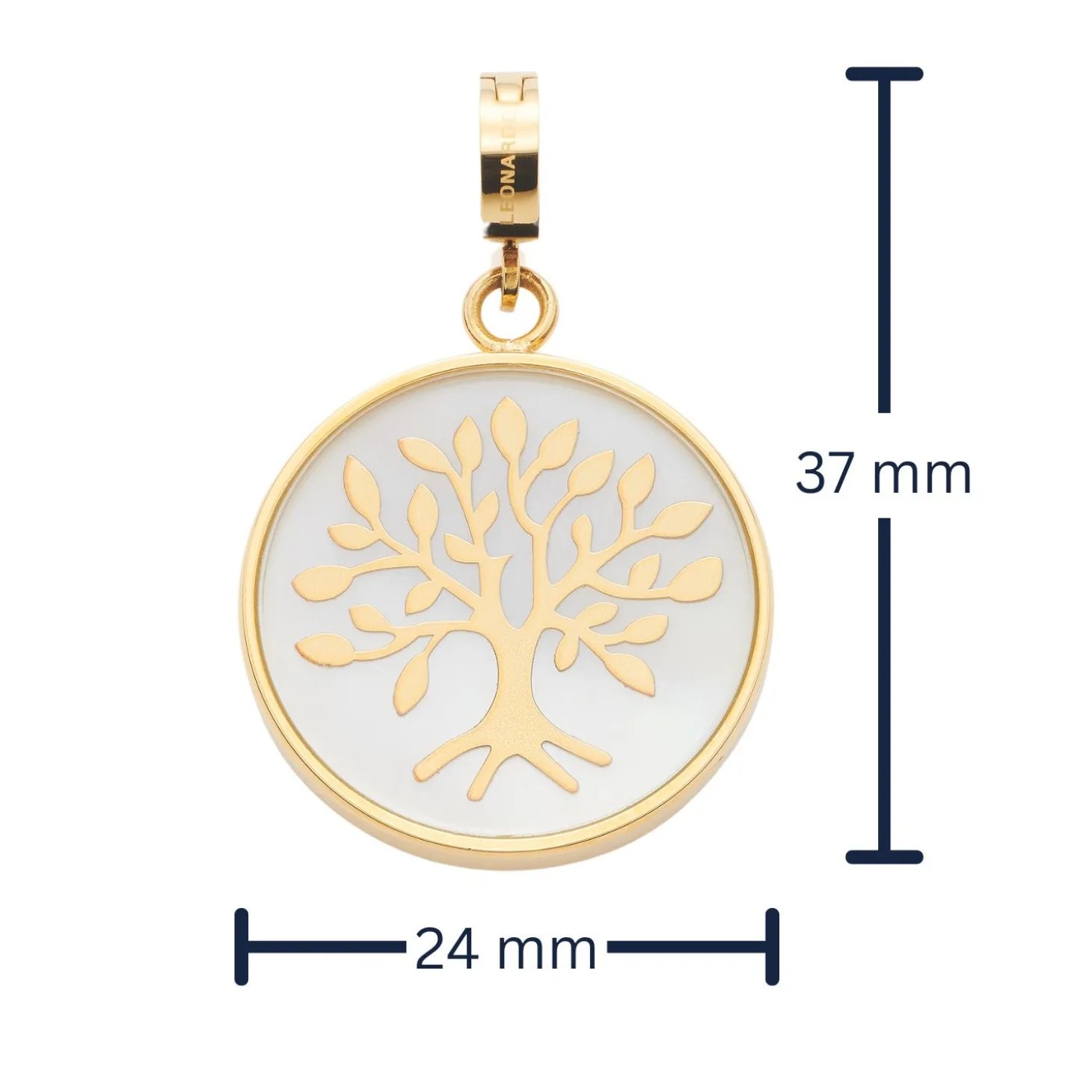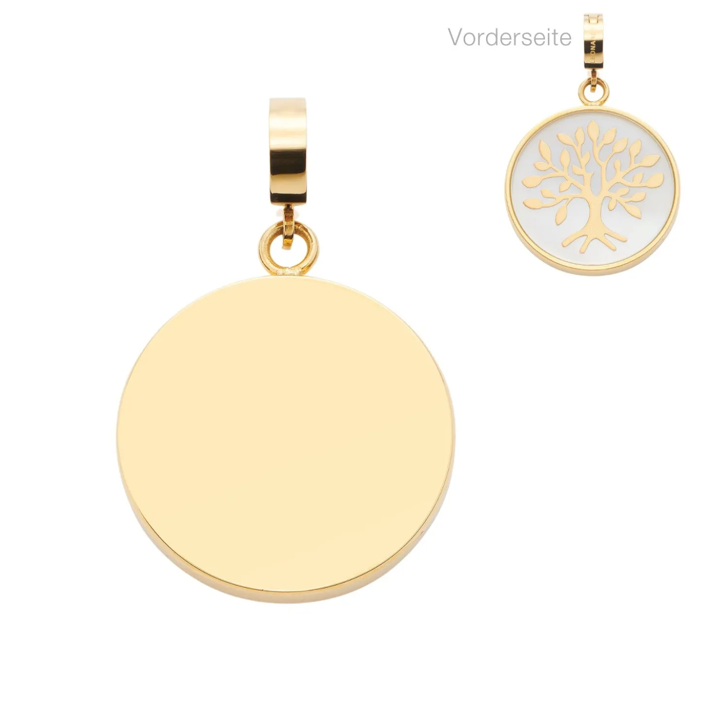 Das Motiv des Lebensbaums fasziniert immer wieder. Kein Symbol steht mehr für das Leben. Durch die weiße Perlmuttscheibe und den goldenen Edelstahl ist dieser aussagekräftige Anhänger aber auch ein richtiger Eyecatcher. Die Rückseite bietet sich an für eine ganz persönliche Gravur.