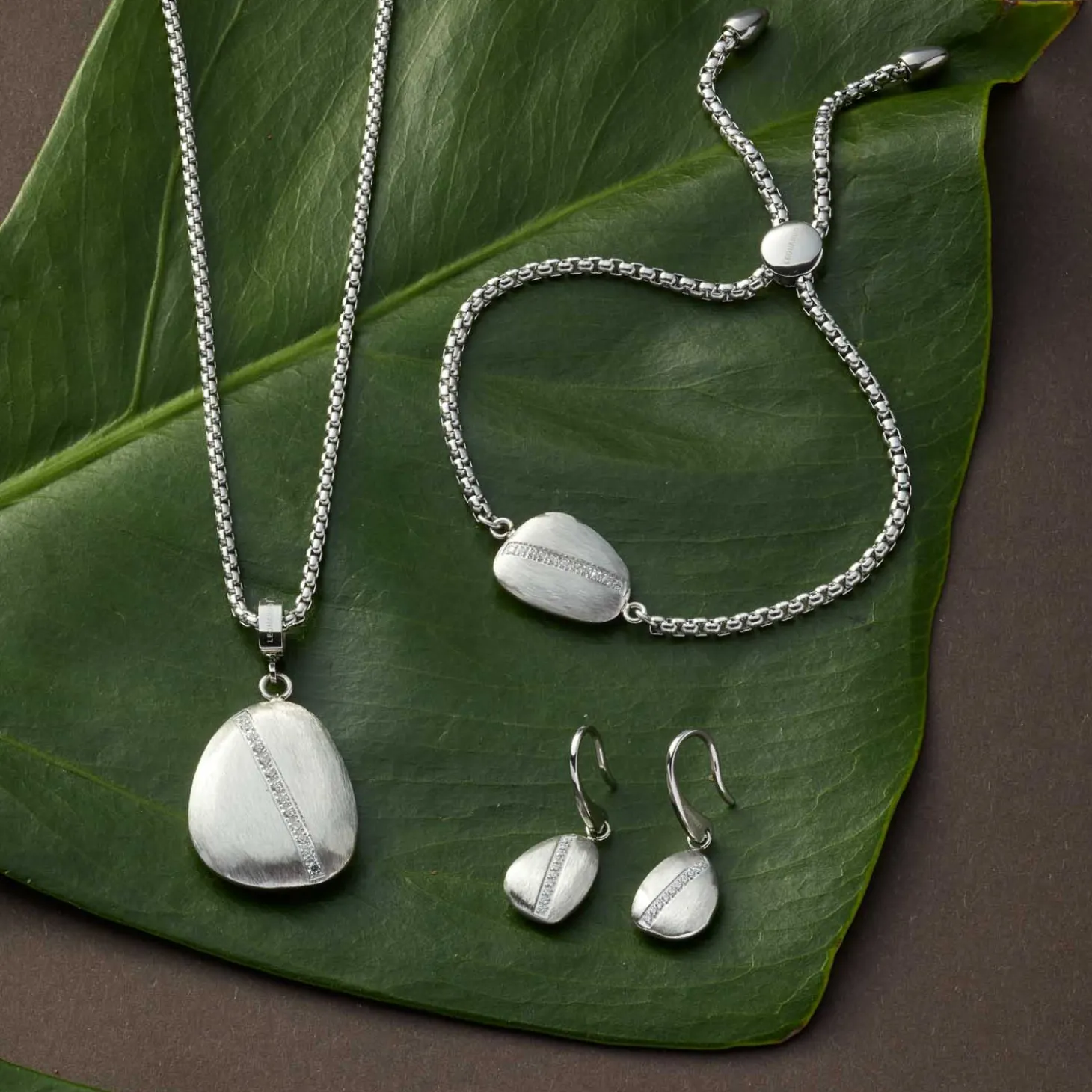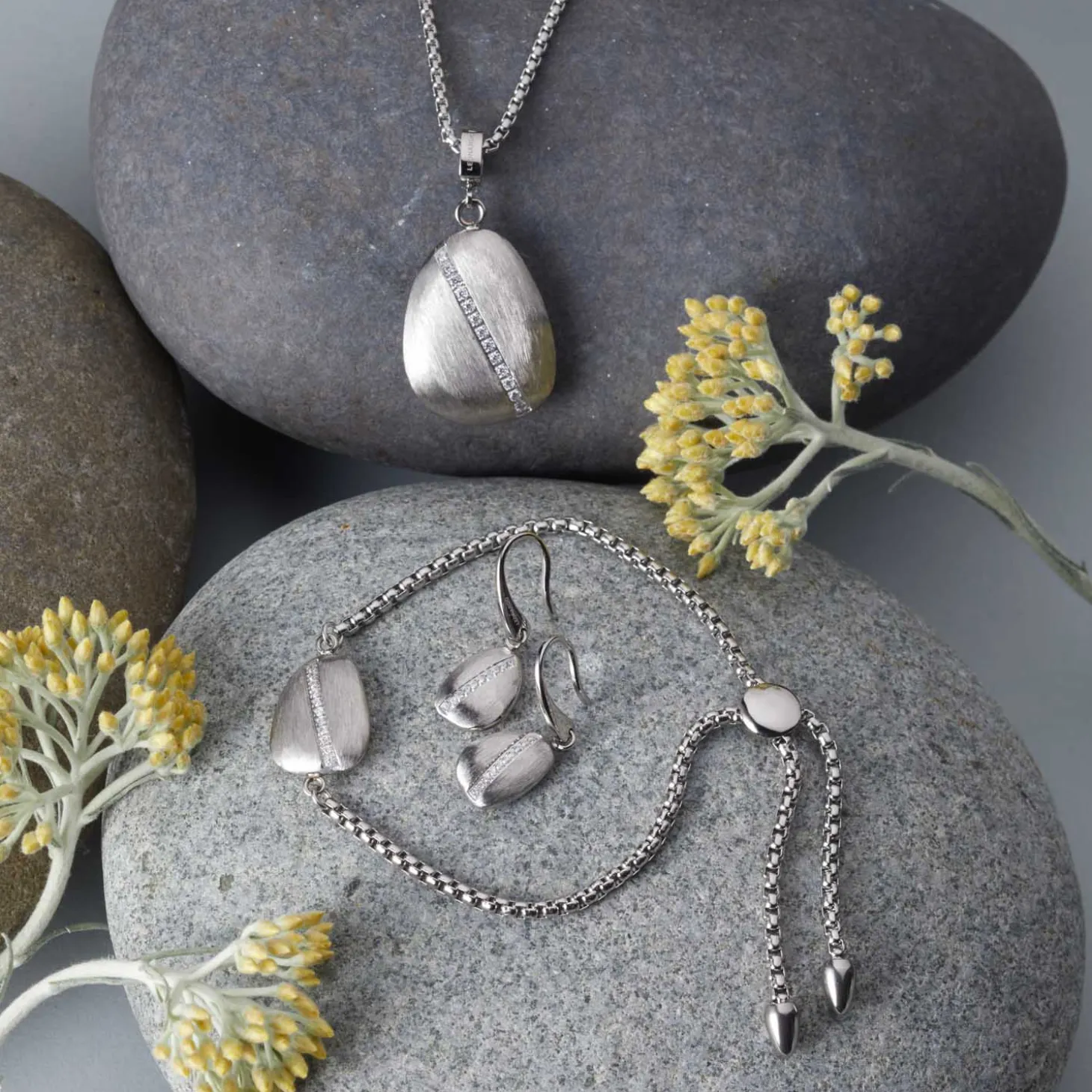 Angelehnt an einen vom Wasser rund geschliffenen Kieselstein ist der Einhänger dieses Edelstahl-Zugarmbands und mit einer matt gebürsteten Oberfläche versehen. Die in einer Linie angeordneten eingefassten Zirkonia-Steinchen liegen wie Wassertropfen auf und unterstreichen das von der Natur inspirierte Design.