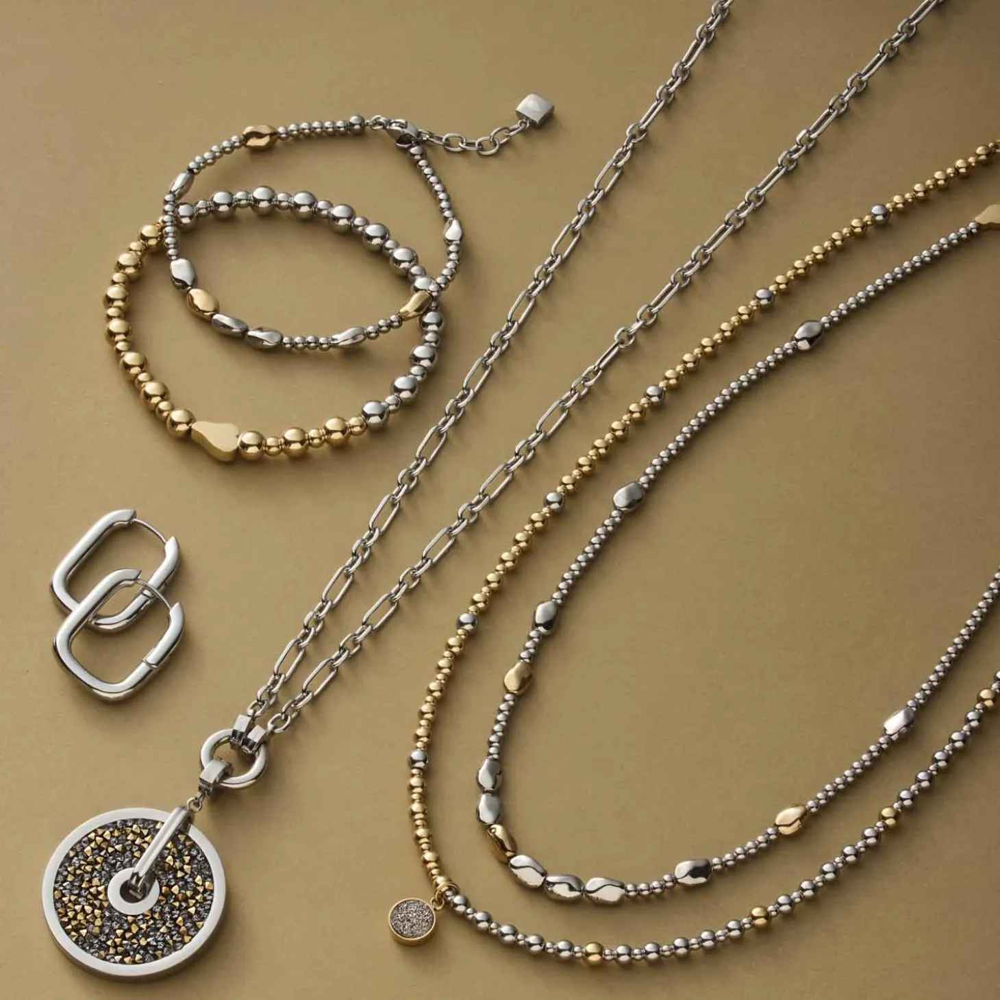 Das Armband VEJA ergänzt die Halskette perfekt und bringt den dezenten Two Tone Look auch an Dein Handgelenk. Die Kombination aus polierten Metallkugeln und unregelmäßig gesetzten Nuggets in Silber und Gold sorgt für eine elegante, moderne Ausstrahlung. Dank Karabinerverschluss und Verlängerungskette lässt sich das Armband bequem anpassen – ob solo getragen oder im Set mit der Kette, dieses Schmuckstück verleiht Deinem Outfit eine stilvolle Note.