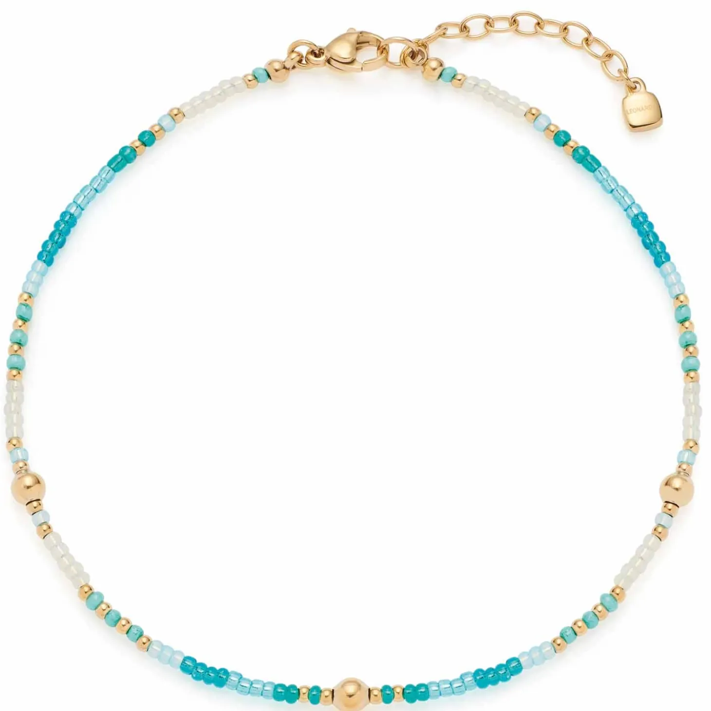 Winzige Rocailles-Glasperlen in strahlenden Aqua-Türkis-Tönen sind bei diesem Fußkettchen dicht an dicht aufgereiht und erzeugen einen bezaubernden Verlauf. Die farbigen Perlen werden durch kleine Edelstahl-Kügelchen mit goldener Ionenplattierung in zwei Größen belebt, die einen faszinierenden Kontrast schaffen und dem Schmuckstück eine spannende Dynamik verleihen. Perfekt kombiniert wird das Anklet mit Kette und Armband Happy.