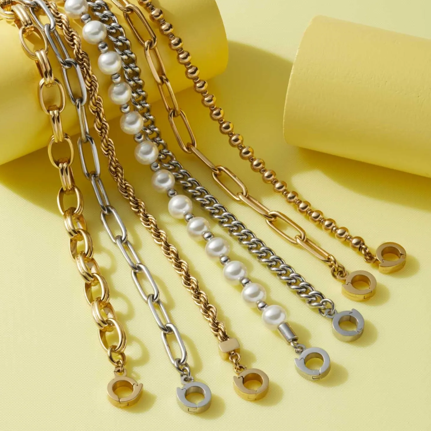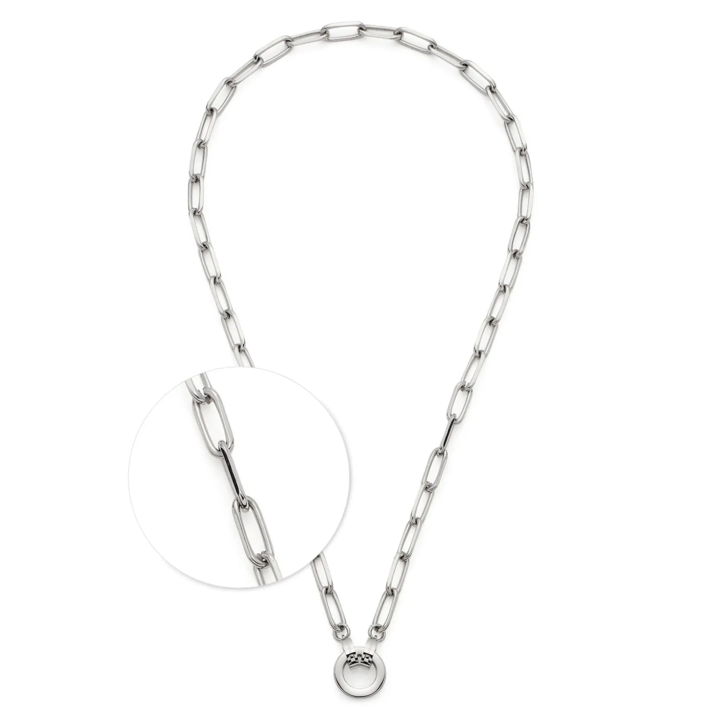 Die weite Ankerkette mit rechteckigen Kettengliedern, auch Paperclip Chains genannt, liegt voll im Trend. Als unkonventionelles Basic lässt sie viel Freiraum für kreative Kombinationen. Mini-Clips und ein kleiner Edelstahlring warten darauf, mit Charms und Anhängern bestückt zu werden.