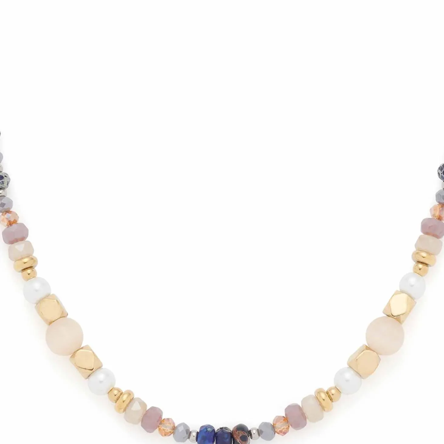 Harmonische Farbkomposition, zeitloses Design und edle Materialien: Diese Kette verschönert einfach jeden Look. Die kurze Kette zeigt sich mit verschiedenen Perlen in Blau, Beige, Creme und Weiß. Im Kontrast dazu hat die Venizianerkette ein Mittelstück aus gereihten Halbedelsteinperlen (Sodalith), Perlmutt- und Glasperlen. Abgerundet wird der stilvolle Mix mit weißen Imitationsperlen und goldenen, facettierten Würfelchen. Eine dezente Optik, die gerade deshalb so besonders wirkt und schön zu allen Cashmere-Looks passt. Der Karabinerverschluss und die Verlängerungskette sind zudem ein praktisches Detail.