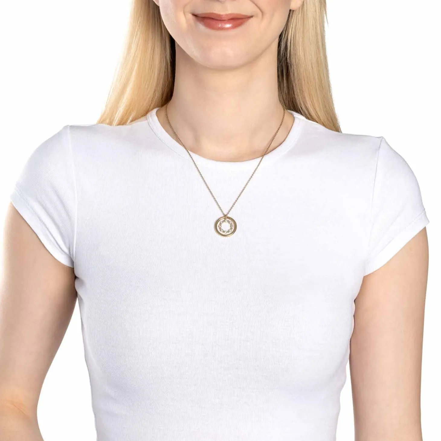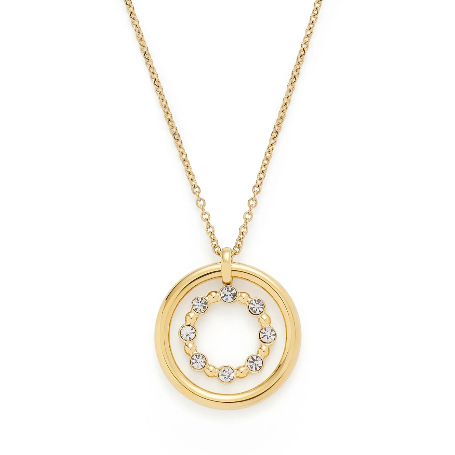 Ein zeitloser Begleiter mit modernem Twist: Die zarte Kette verzaubert mit einem beweglichen Anhänger. Ein äußerer Goldring in glatter Optik bildet hierbei die perfekte Bühne für den funkelnden Innenring. Dieser besteht aus runden, facettierten Steinen, die sich im Wechsel mit kleinen Goldkugeln zeigen. Je nach Bewegung und Lichteinfall erstrahlt der Anhänger in neuem Glanz – ein Piece, das mit Purismus und glamourösen Details überzeugt.