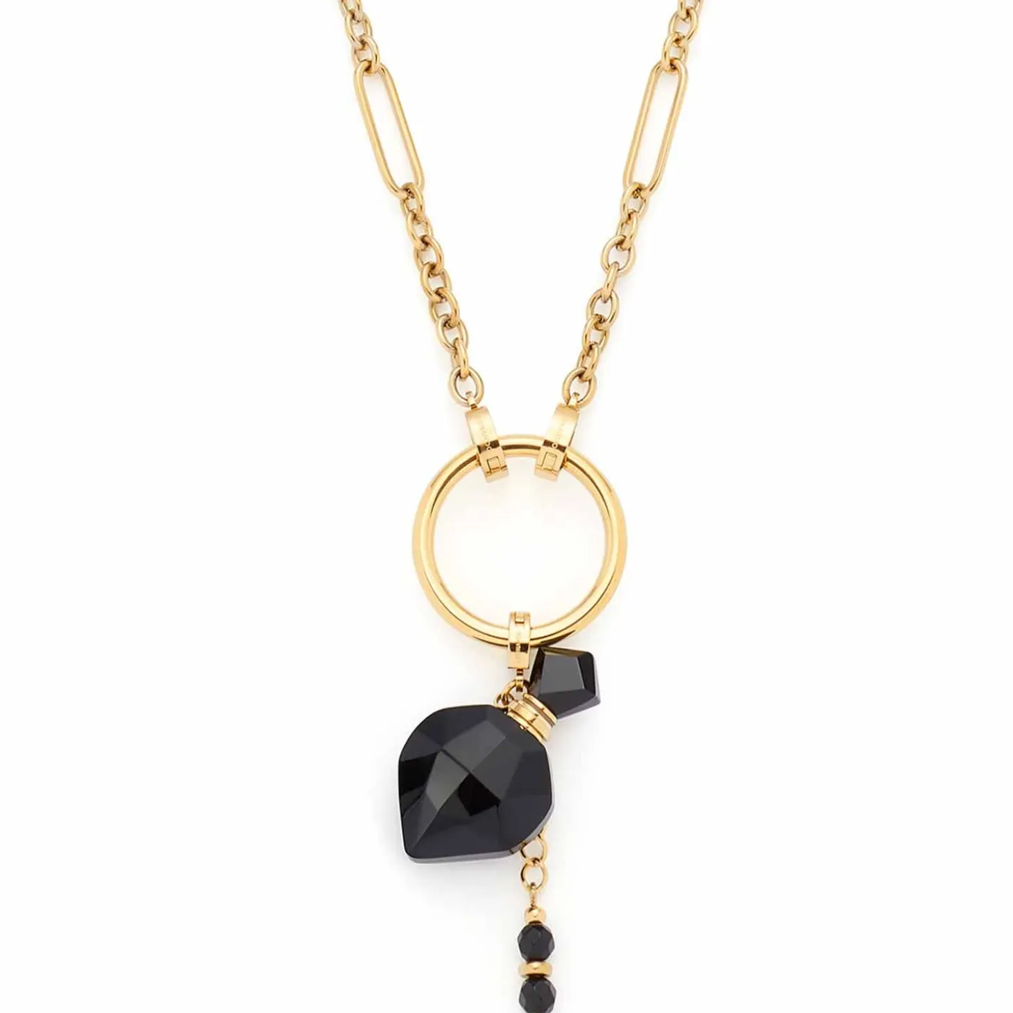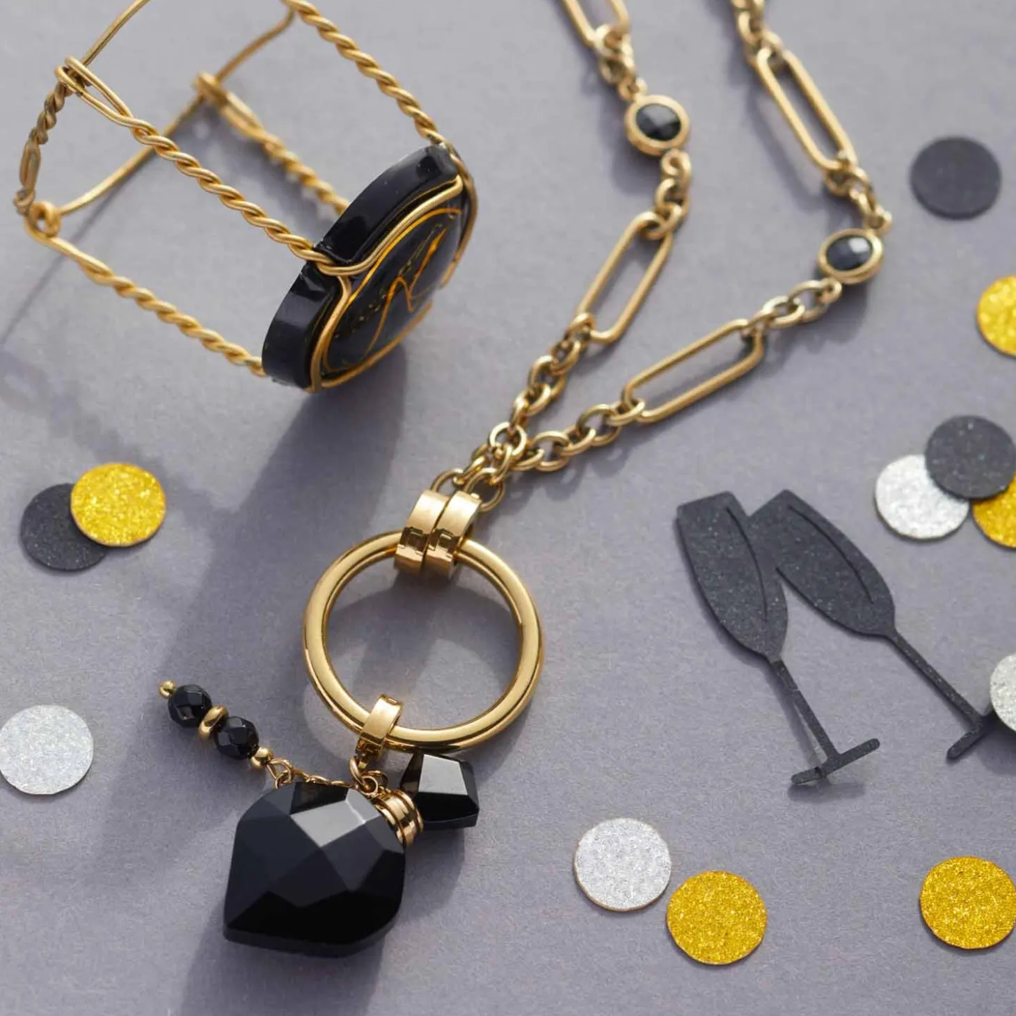 Die Kette setzt auf einen edlen Mix aus Schwarz und Gold. Ein längliches Kettenglied wird kombiniert mit drei runden Gliedern. Unterbrochen wird dieses sich wiederholende Segment von runden, facettierten Glassteinen in Schwarz. Verbunden wird die lange Kette mit zwei M-Clips und einem großen Ring zum Einclippen. Das absolute Highlight dieser Kette ist aber der Mini-Flacons aus schwarzem Stein. Der Anhänger hat einen S-Clip und wird zusätzlich durch zwei an einem kleinen Kettchen baumelnde Steinperlen in Schwarz verziert. Die Kette lässt sich mit allen Teilen der Clip&Mix-Serie kombinieren.