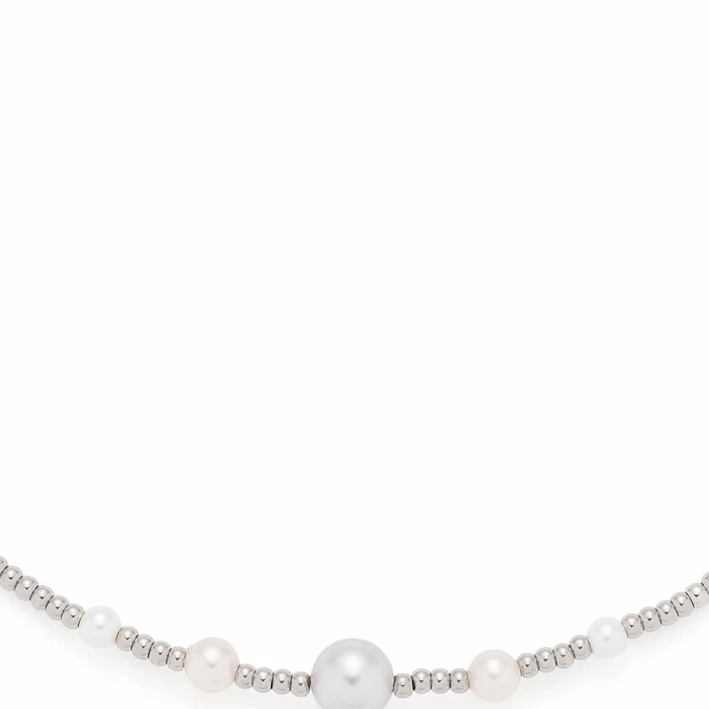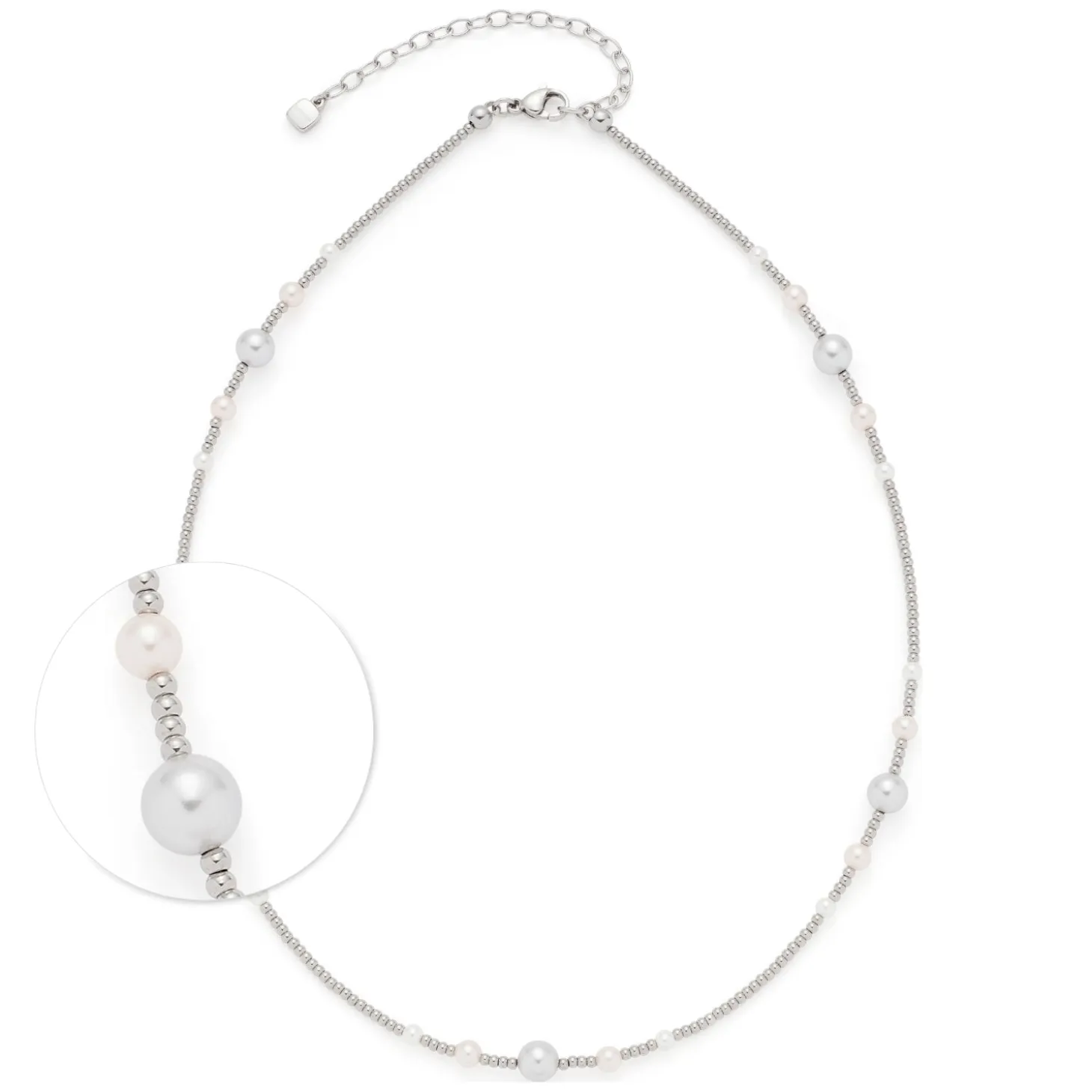 Feine Perlen in drei unterschiedlichen Farbnuancen schenken der kurzen, rundliegenden Kette ihren puristisch-eleganten Look. In symmetrischen Abständen sind verschieden große Perlen in Weiß, Creme und Hellgrau mit Stahlkügelchen zu diesem zarten Collier aufgereiht. Die Perlen bilden einen schönen Bruch zum polierten Edelstahl. Ein Karabinerverschluss und eine Verlängerungskette sorgen für einen optimalen Sitz. Alles in allem eignet sich die Kette hervorragend für trendstarke Layering-Looks.