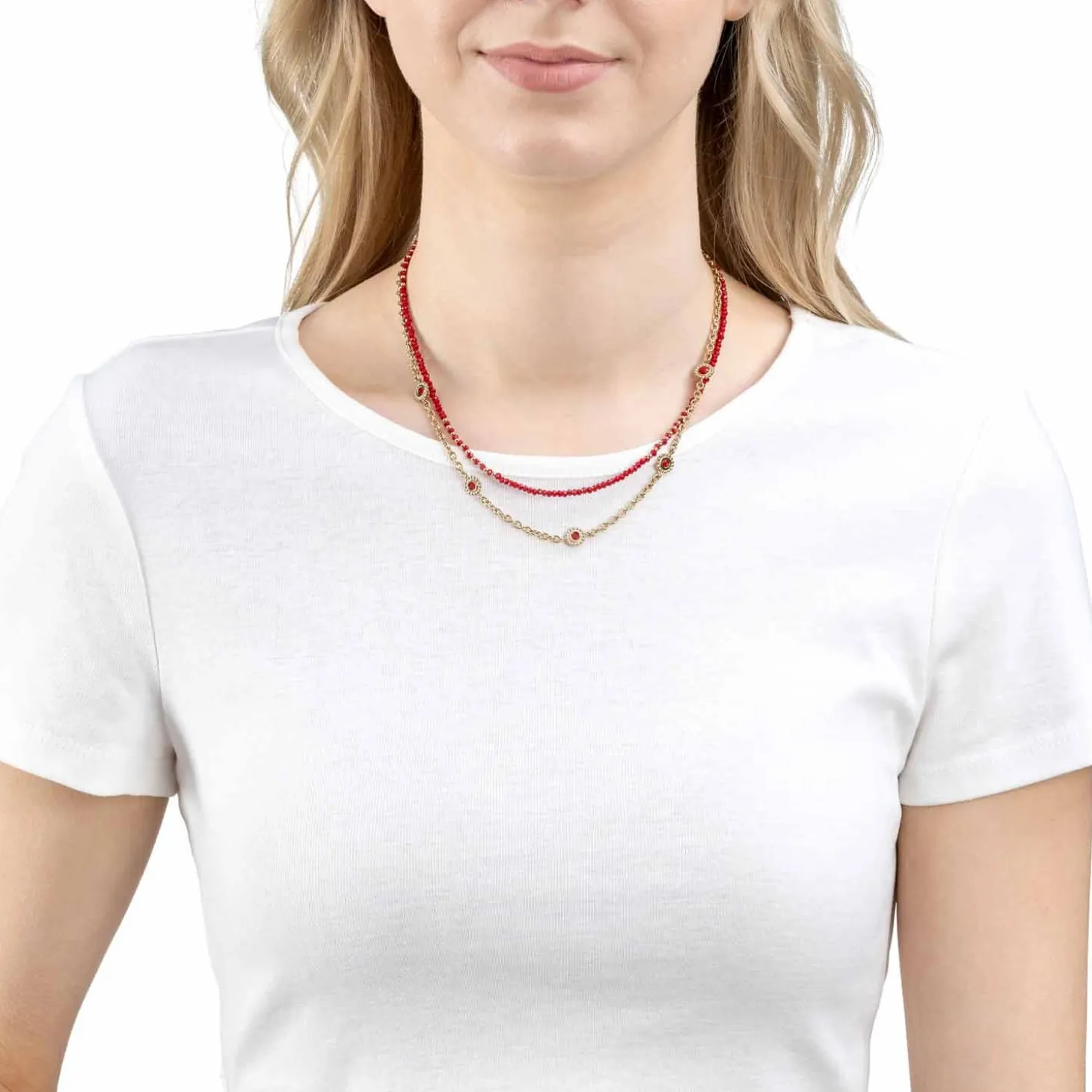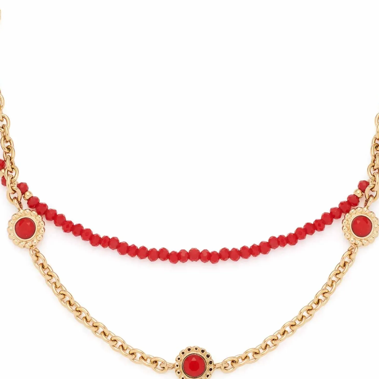 Die zweireihige Halskette ist mit der trendstarken Farbkombination gold-rot ein echter Hingucker. Eine Reihe bilden winzige, dunkelrote und facettierte Glasperlen, die durch kleine, goldene Edelstahlkügelchen kontrastiert werden. Eine schlichte Ankerkette bildet den zweiten Strang. In regelmäßigen Abständen sind runde, abstrahierte und mit dunkelrotem, facettiertem Glasstein komplettierte Blüten-Elemente in die Kette eingehangen. Mit einem hohen Maß an Fashion-Know-how setzt das kurze Collier das Dekolleté in Szene.