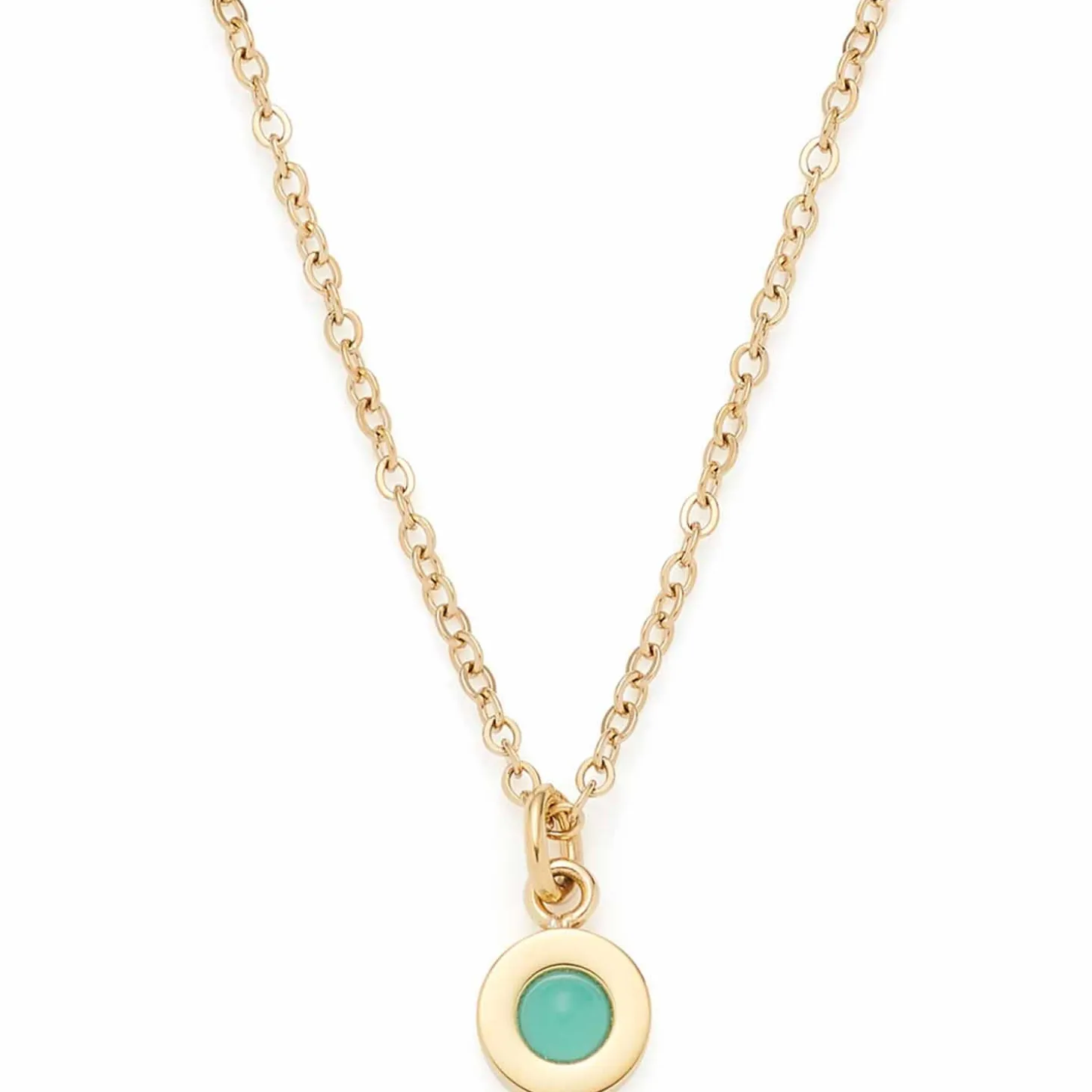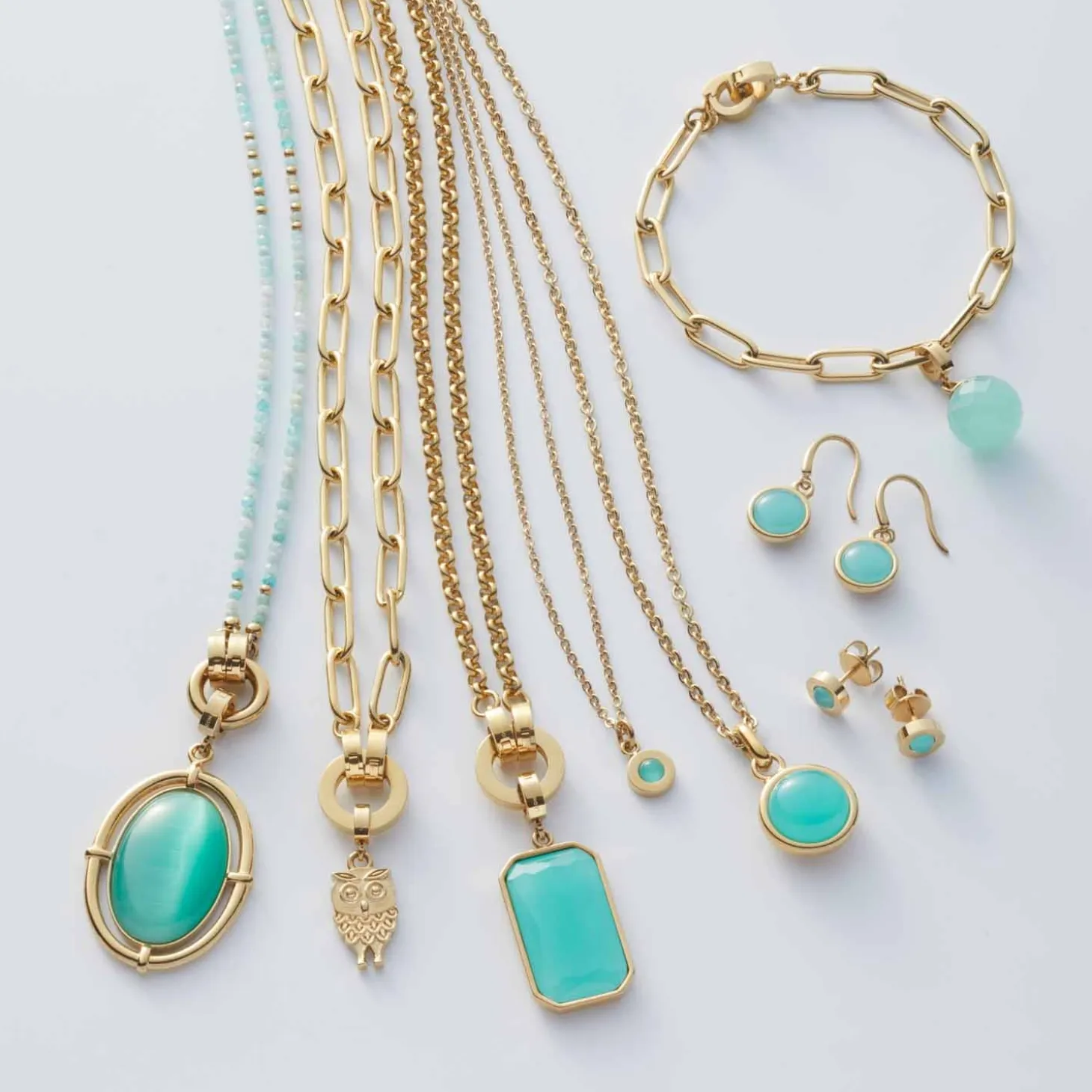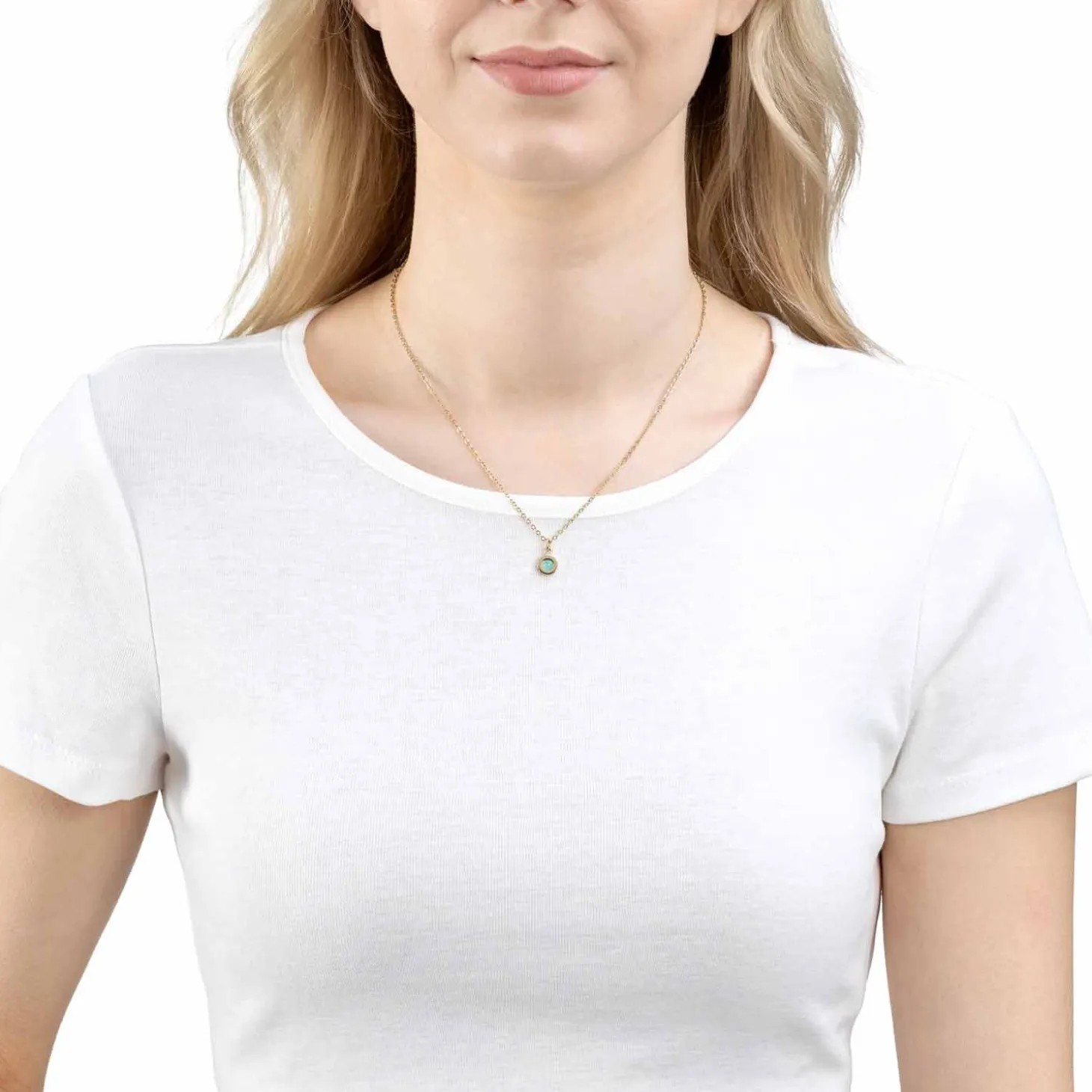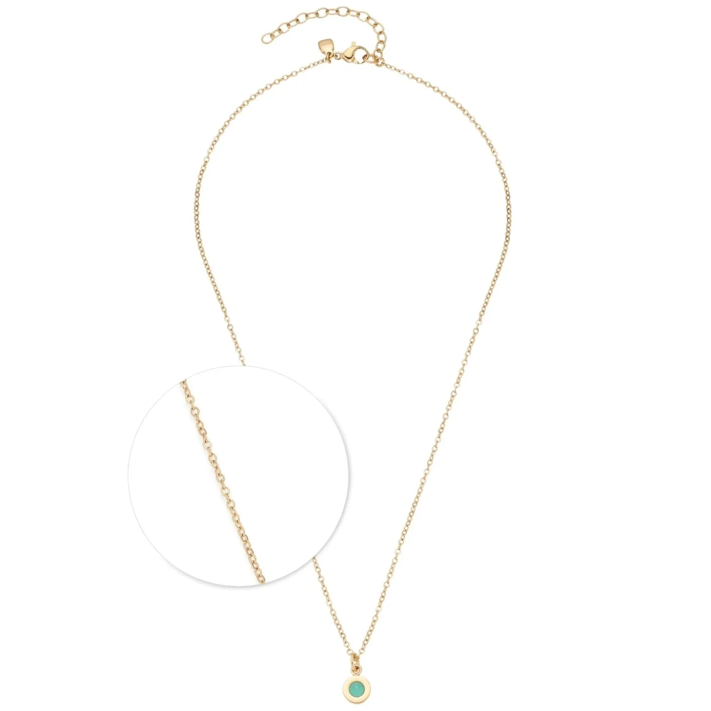 Ein filigranes Schmuckstück, das durch sein klassisches Design eine feminine Ausstrahlung verleiht. Die zarte Halskette ist funkelnd diamantiert und trägt einen kleinen Anhänger mit farbigem Hingucker. In der Mitte des Anhängers ist ein runter glatter Cabochon aus aqua-farbenem, opakem Glas platziert. Farblich harmoniert dieser perfekt mit der goldenen Ionenplattierung.
