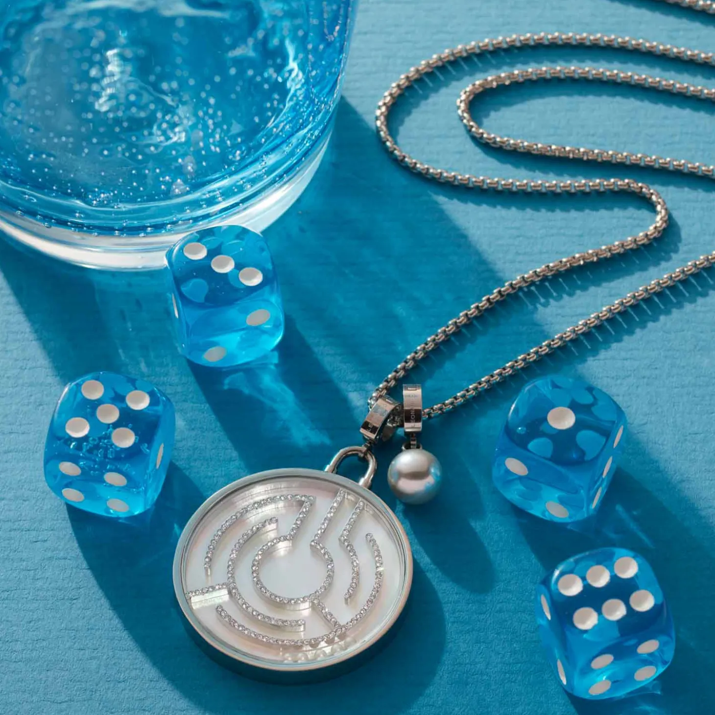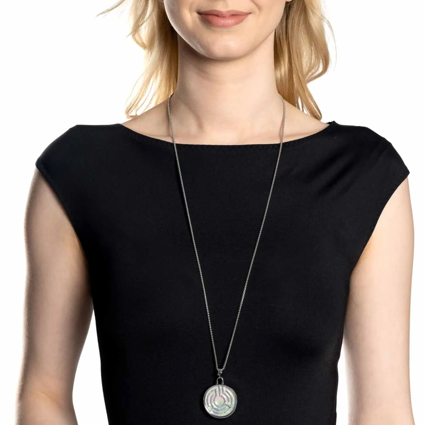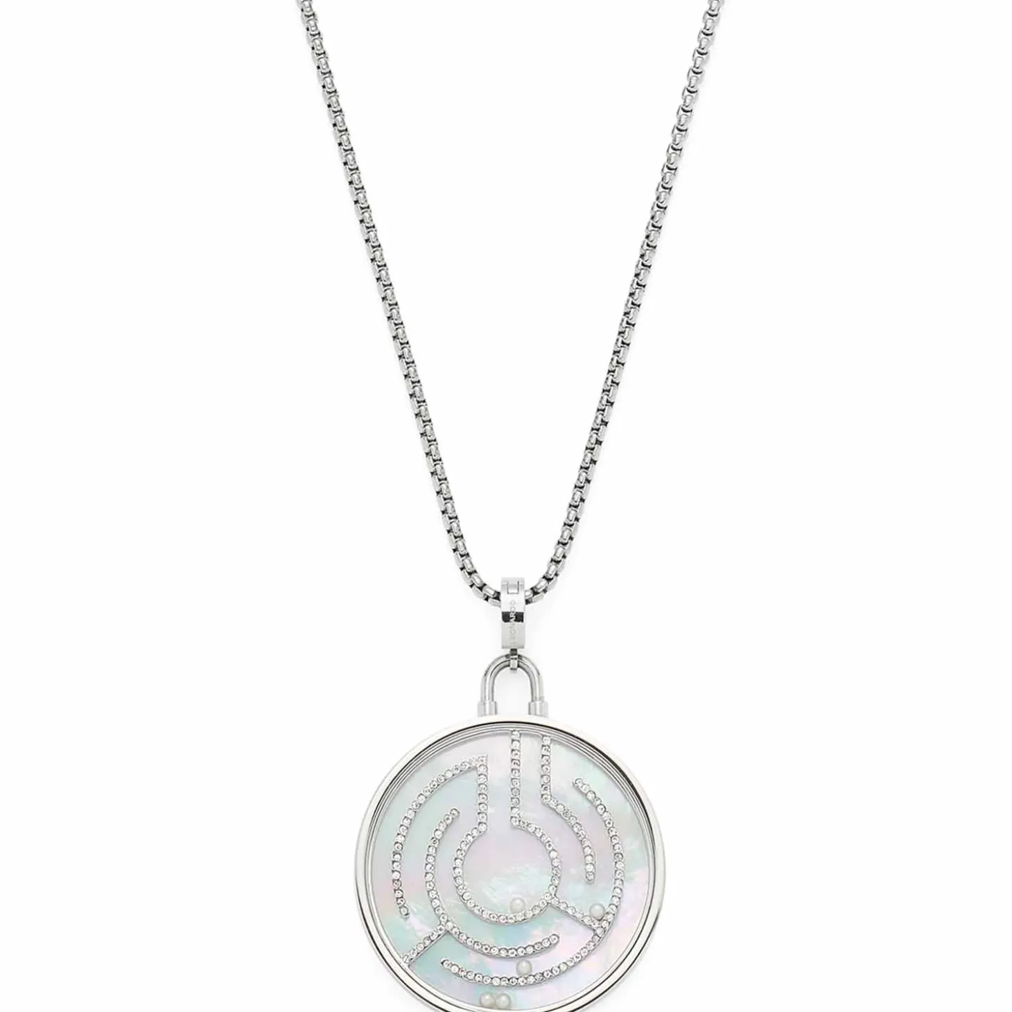 Wenn es um modernes Design, edle Materialien und coole Details geht, liegt die Kette ganz weit vorne. Die lange Ankerkette zeigt sich mit einem großen, runden Anhänger. Dieser begeistert mit einem kleinen Geschicklichkeitsspiel. In dem Anhänger mit Uhrenglas können fünf kleine Perlen durch ein Labyrinth in die Mitte geführt werden. Abgerundet wird der stilvolle Look der Kette mit kleinen, funkelnden Zirkonia Steinchen an den Wänden des Labyrinths. Als Aufhängung dient ein Clip Größe M und schließen lässt sich die Kette dank des Karabinerverschlusses und der Verlängerungskette besonders variabel.