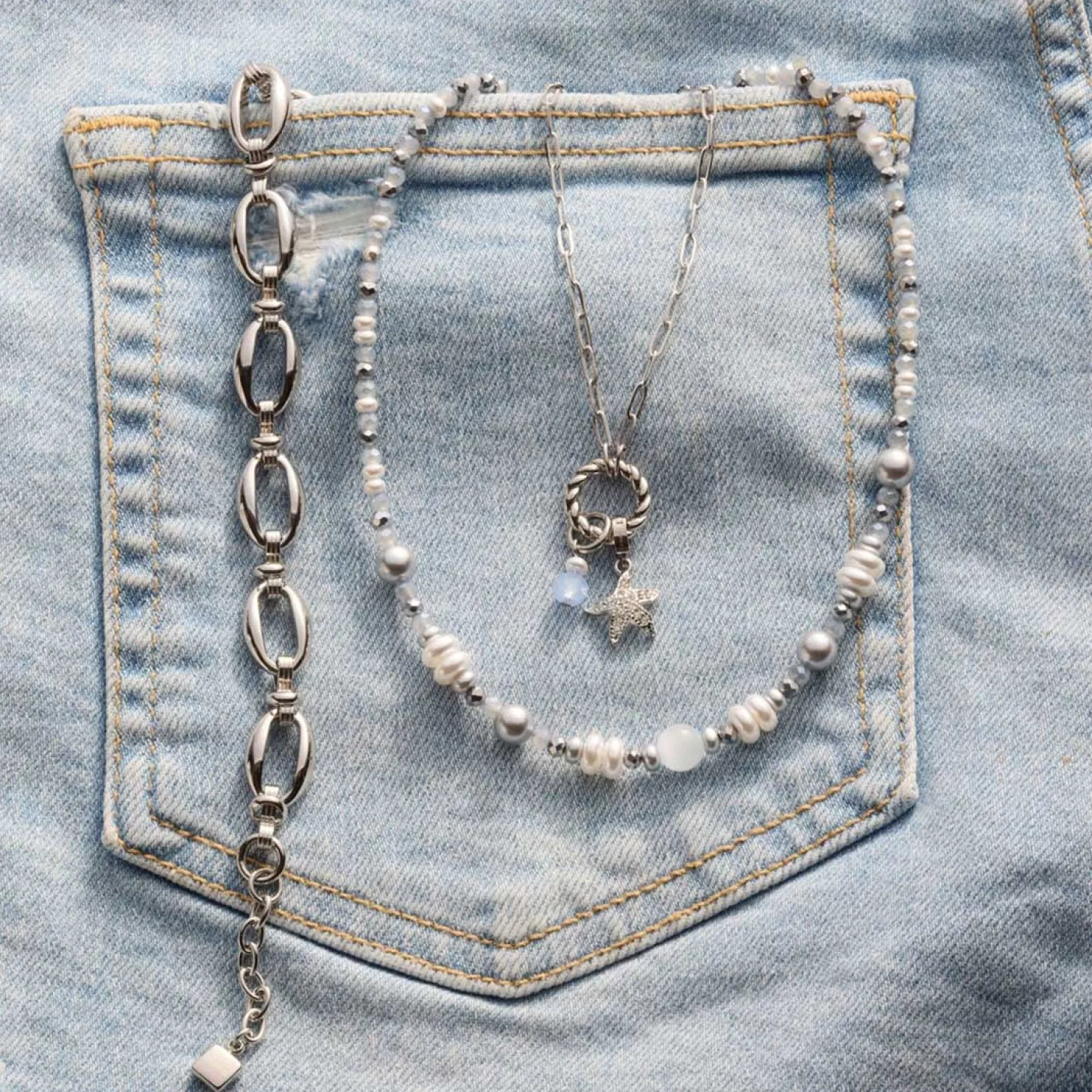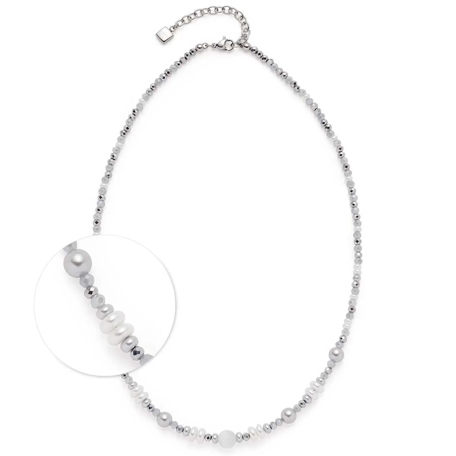 Die Kette KLARA von JEWELS BY LEONARDO ist ein eleganter Begleiter für alle, die zarte Farben und moderne Eleganz lieben. In einer harmonischen Mischung aus Weiß, Grau und sanftem Blau vereint sie glänzende Metallakzente mit schimmernden Perlen und Hämatit-Elementen. Die mittig platzierte, größere Perle bildet den strahlenden Mittelpunkt, von dem aus sich die Kette sanft nach hinten verjüngt. Ihr Farbspiel in der Trendnuance „Blue Aura“ verleiht ihr eine kühle, sommerliche Leichtigkeit, die perfekt zu modernen Metallic-Looks passt. Durch den Karabinerverschluss mit Verlängerungskette lässt sich die Länge individuell anpassen – ideal für verschiedene Ausschnittformen. Ob zu schlichten Outfits oder eleganten Styles: KLARA bringt dezente Eleganz und frische Akzente in dein Schmuckstyling. Besonders schön wirkt sie in Kombination mit passenden Armbändern oder Ohrringen von JEWELS BY LEONARDO.