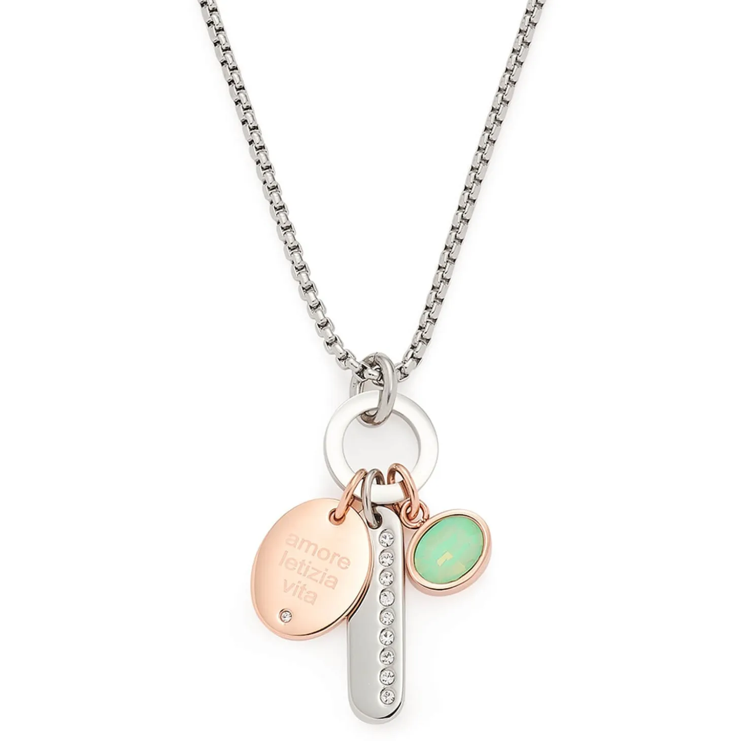 Amore, Letizia, Vita ist als Gravur auf einem Element des Anhänger-Trios in modischer Bicolor-Optik zu lesen. Weitere Highlights sind die kleinen Kristalle sowie der opalisierende Glas-Cabochon in sommerlichem Mintgrün. Der trendstarke Anhänger wird von einer kurzen Venezianerkette aus Edelstahl gehalten. Ein Schmuckstück für den täglichen Gebrauch unterstreicht den