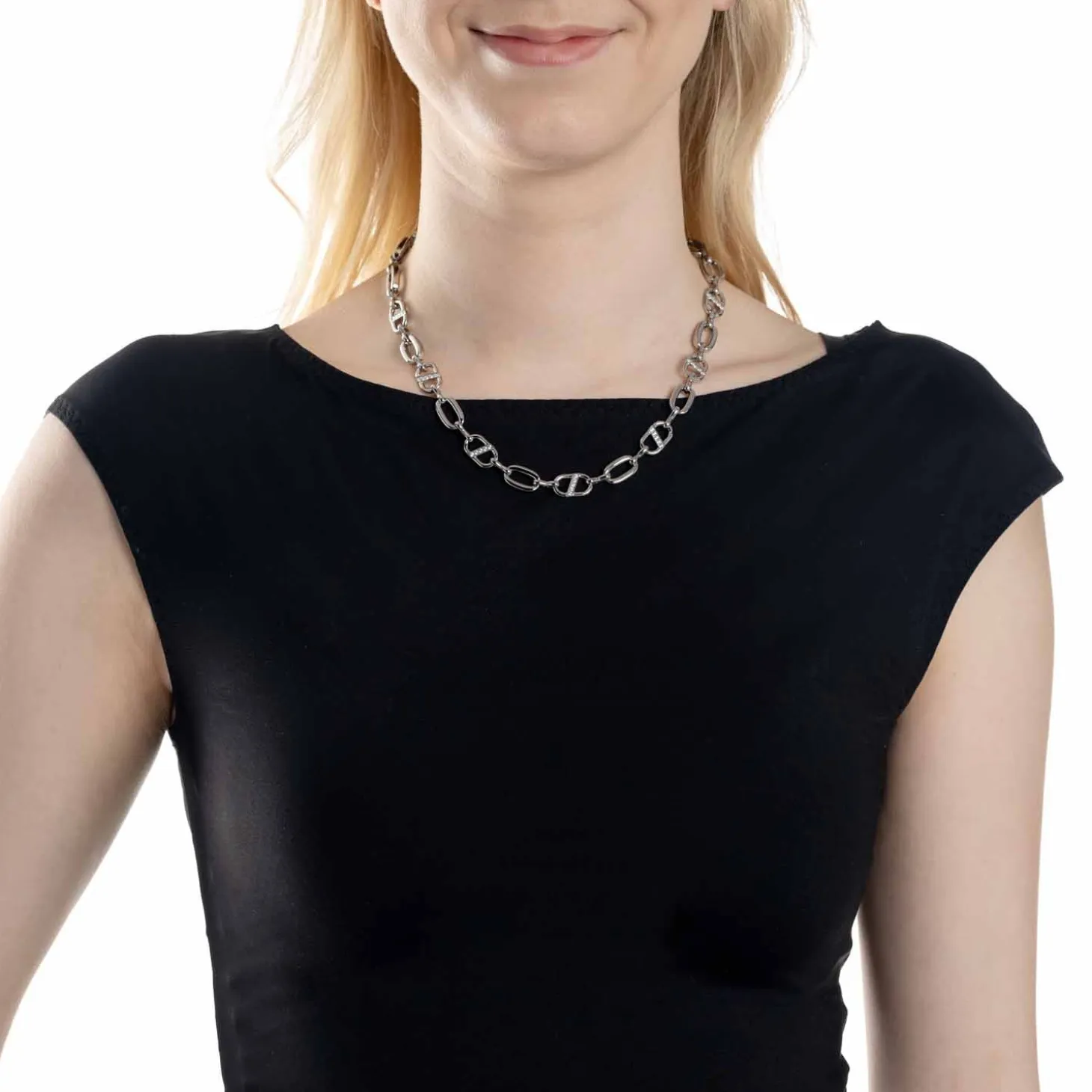 Diese kurze Kette zeichnet sich durch einen auffälligen, trendstarken Glieder-Look aus. Die Kettenglieder mit pavébesetztem, diagonalen Steg überzeugen hier im Wechsel mit schlichten Gliedern. Das kurze Collier spielt mit dem Kontrast aus dem kühl-glänzenden Edelstahl und zart funkelnden Zirkonia Steinchen. Das Ergebnis ist ein wunderschönes, anschmiegsames Schmuckstück, das sowohl im Alltag als auch im eleganten Abendlook begeistert. Durch den Karabinerverschluss und die Verlängerungskette ist die Kette in der Länge verstellbar.
