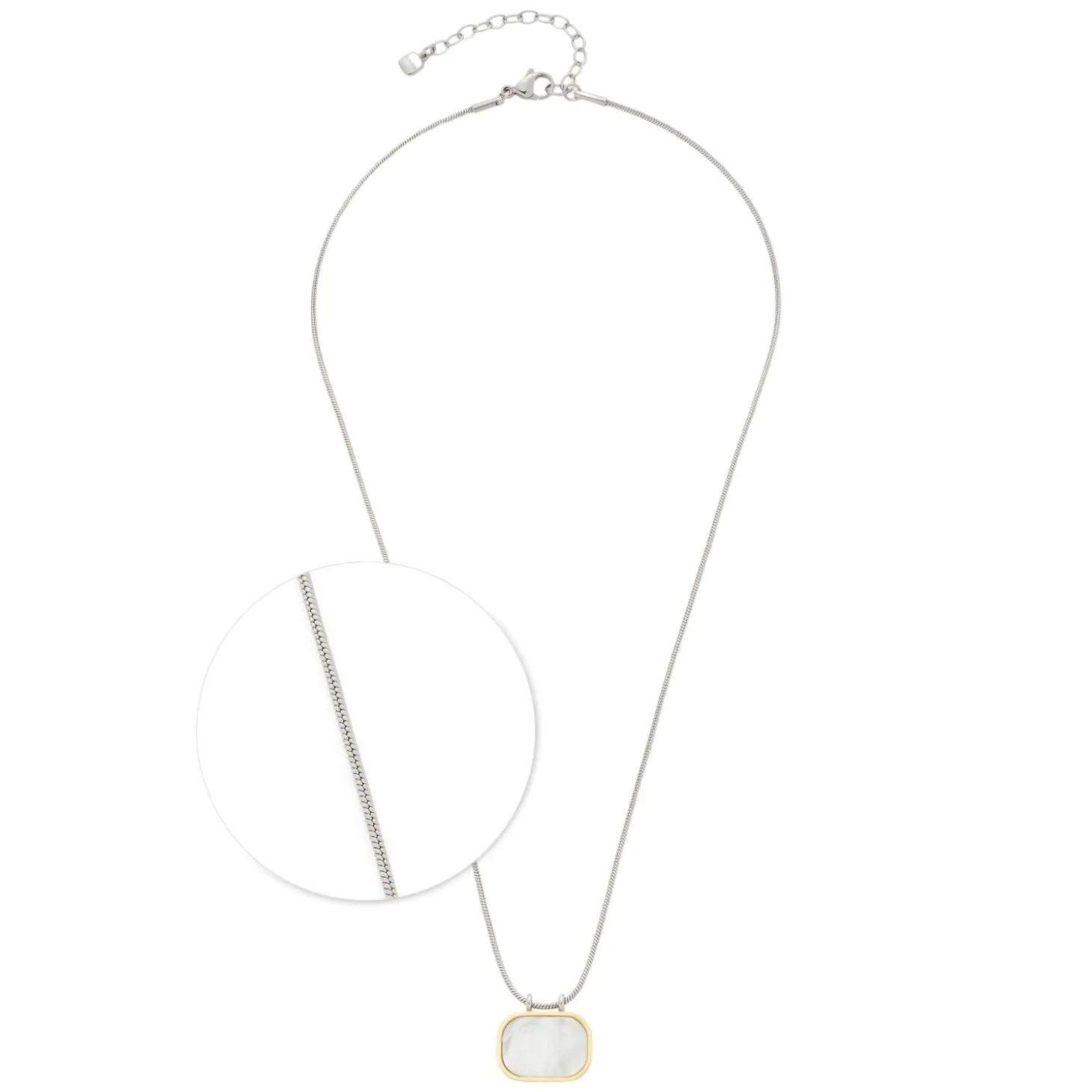 Bicolor-Optiken haben sich in der Welt von Colliers, Armbändern und Ohrsteckern einen festen Platz gesichert. Auch diese feine Schlangenkette setzt mit ihrem Anhänger in stark abgerundeter Rechteckform auf dieses sichere Trend-Design. Der frei schwingende Crossway-Edelstahl-Charm besitzt einen golden ionenplattierten Rand und ist mit weißem Perlmutt ausgelegt. Die anschmiegsame Schlangenkette schließt mit Karabiner und Verlängerungskettchen.