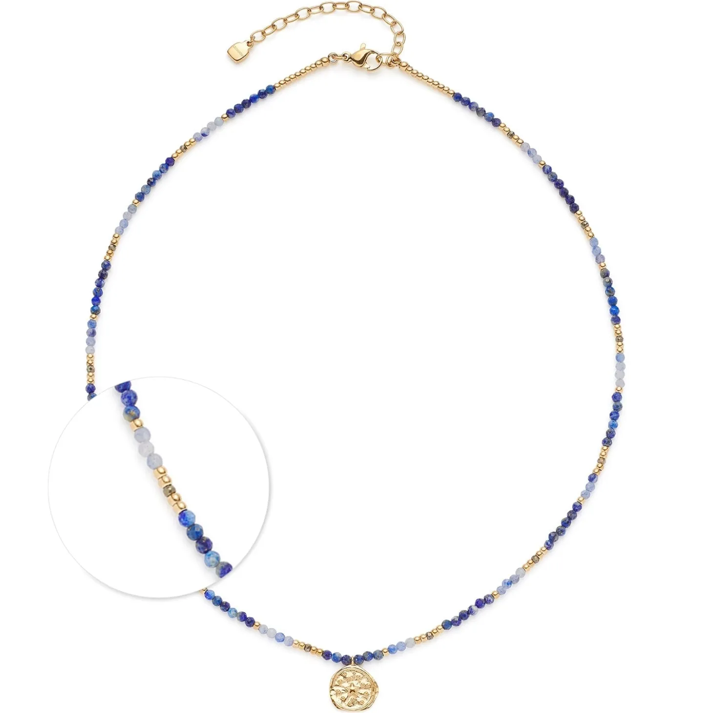 Die Halskette ROSE verbindet den nostalgischen Charme des Retro Blue-Trends mit modernen Akzenten. Feine Steinperlen aus Lapis, Sodalith und Achat in unterschiedlichen Blaunuancen reihen sich elegant aneinander und werden von kleinen Hämatit- und Goldkugeln harmonisch unterbrochen. Im Mittelpunkt der Kette steht ein goldfarbener Anhänger, dessen unregelmäßige Form und geprägte Oberfläche an eine antike Münze erinnert – ein besonderer Blickfang für jedes Outfit. Dank Karabinerverschluss mit Verlängerungskette lässt sich die Länge flexibel anpassen, ideal für den Alltag oder besondere Momente.
