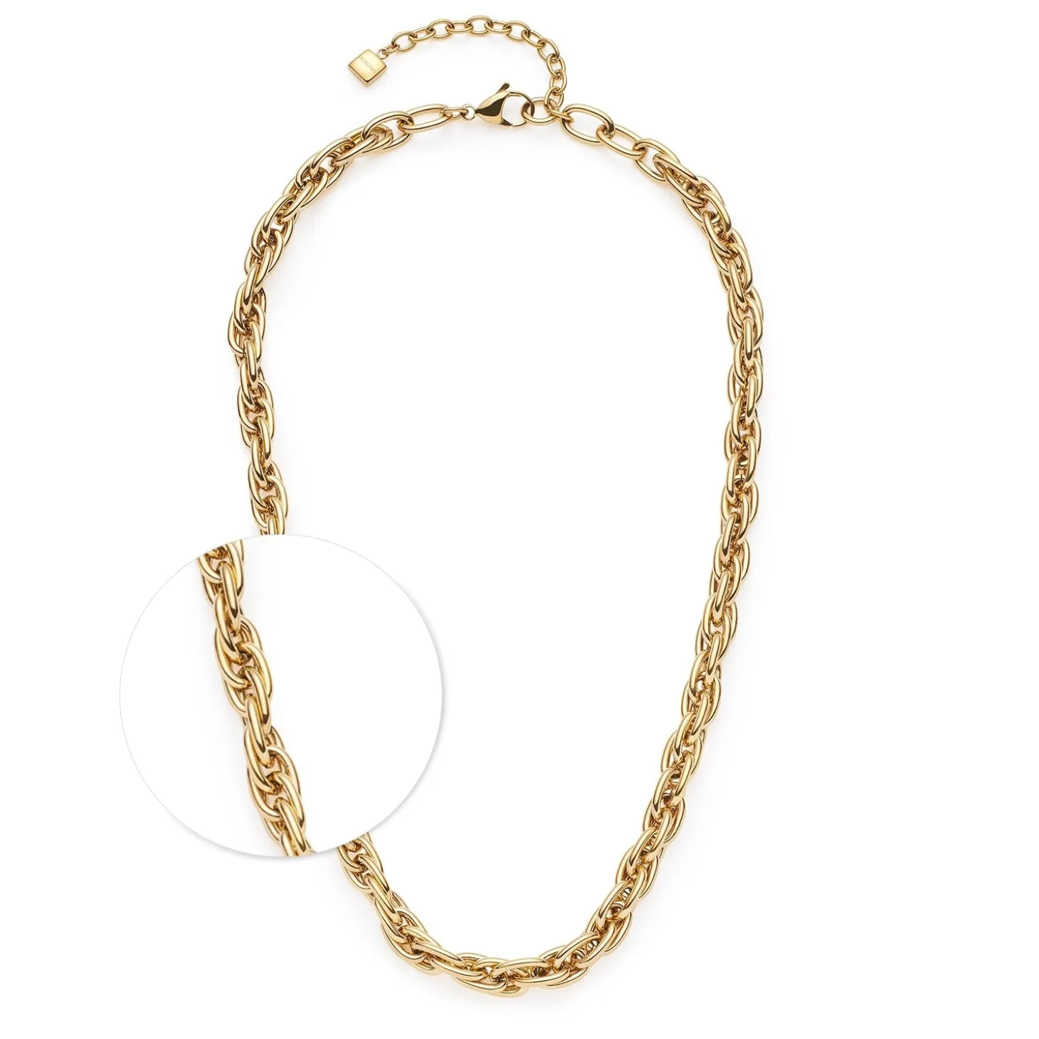 Die Halskette SINA steht für selbstbewusste Eleganz und setzt mit ihrer kräftigen Gliederstruktur ein klares Statement. Die kurzen, dicht ineinander gehängten ovalen Kettenglieder erinnern an ein modernes Zopfmuster und verleihen dem Halsschmuck optisches Volumen bei angenehmem Gewicht. Ob in schlichter Edelstahl-Optik oder in glänzendem Gold – diese Kette bringt den Bold Elegance-Trend perfekt zur Geltung. Der Karabinerverschluss mit Verlängerungskette sorgt für optimalen Tragekomfort und flexible Längenanpassung.