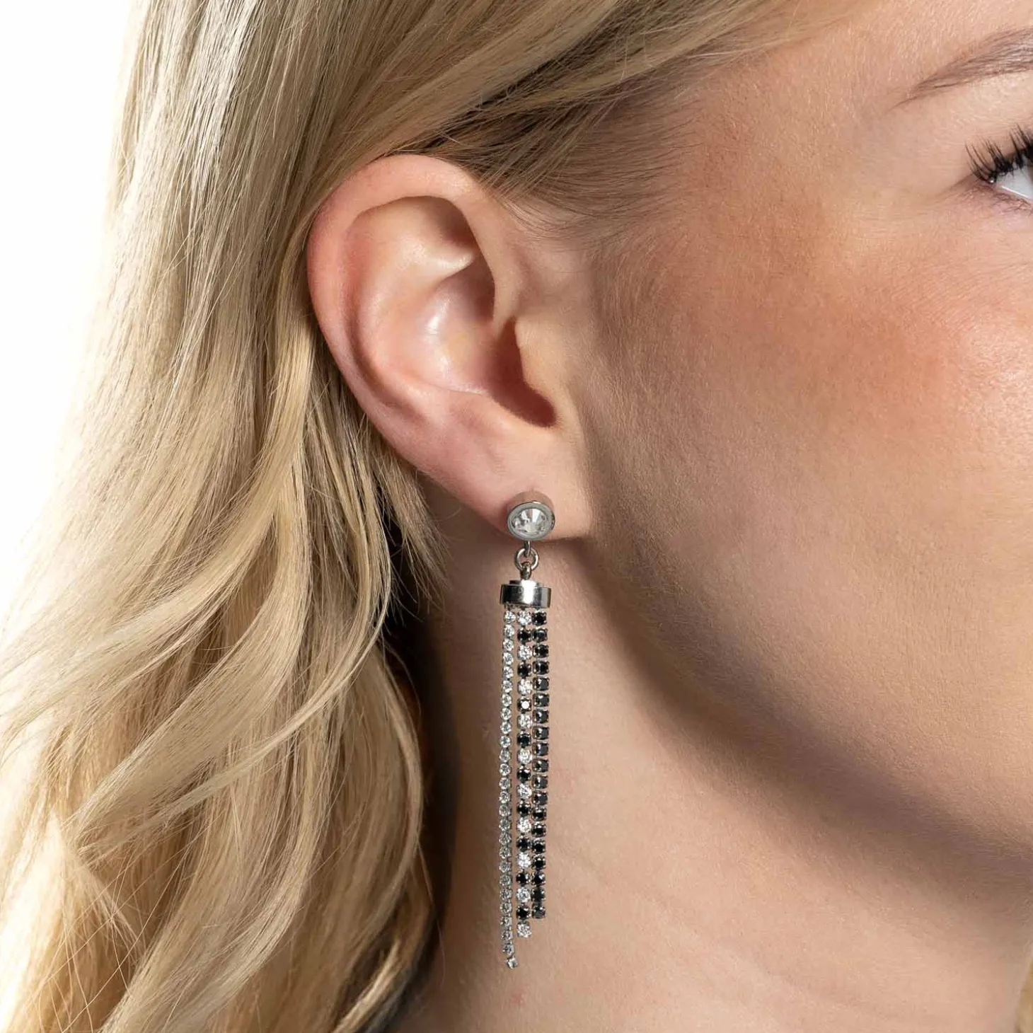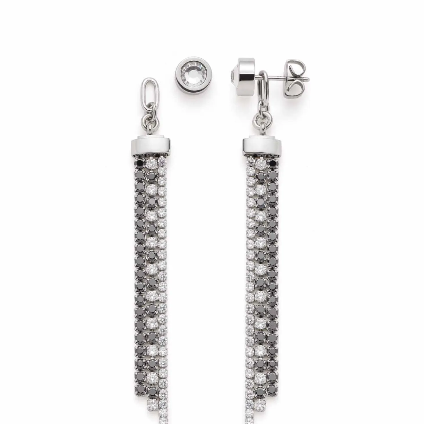Glamourös, raffiniert und so besonders – diese Ohrstecker begeistern mit ihrem trendbewussten, langen Design. Ein schlichter Ohrstecker, der auch solo getragen werden kann, präsentiert sich mit weißem Solitär. Mit der aufsteckbaren Verlängerung wird er im Handumdrehen zu einem funkelnden Begleiter für den Abend. Die Verlängerung lässt sich einfach auf den Stift schieben. Diese besteht aus drei beweglichen Strängen, die mit weißen und schwarzen Zirkonia Steinchen besetzt sind. Vor allem in der Kombi mit hoch gesteckten Haaren kommen die Ohrstecker elegant zur Geltung.