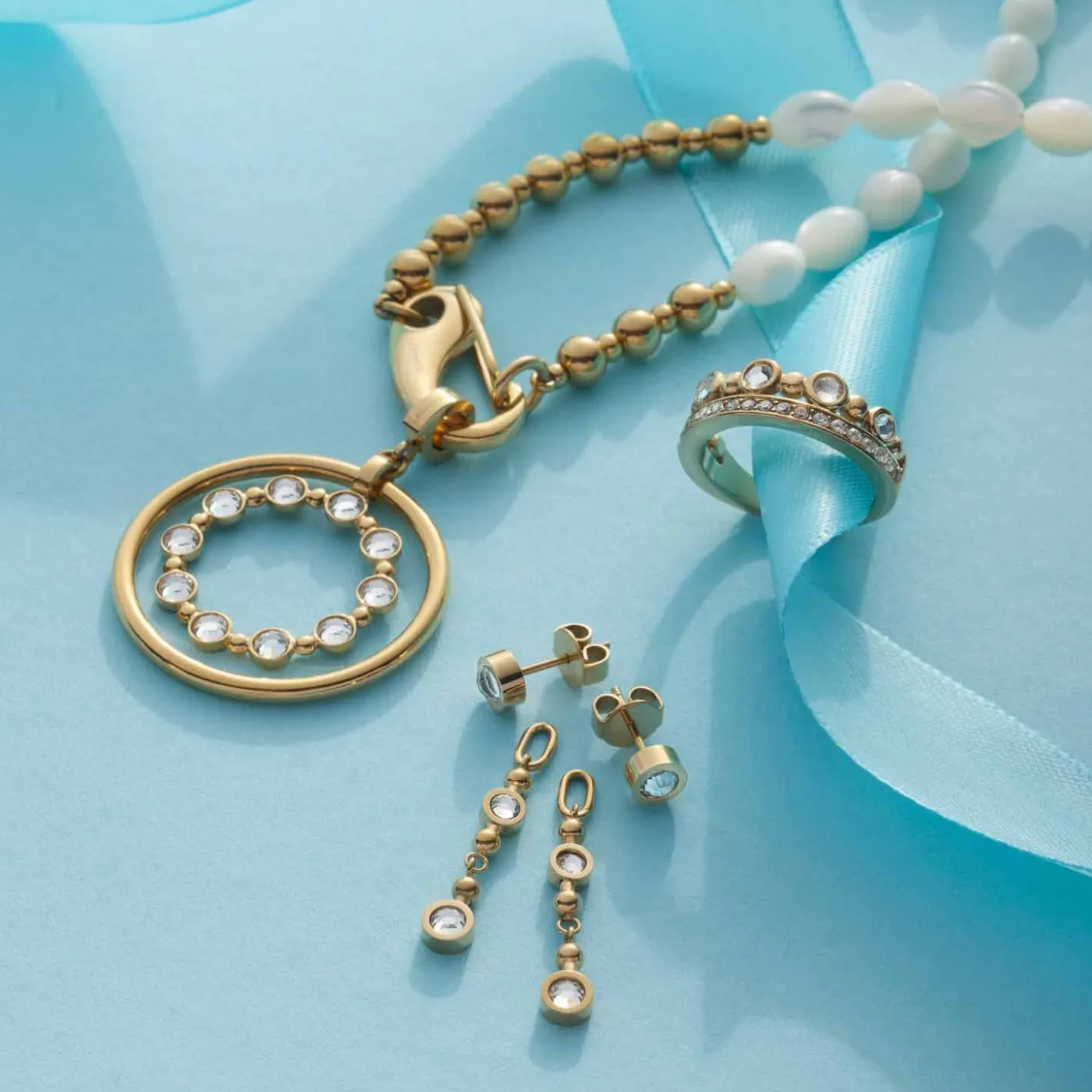 Hier kommt ein Schmuckstück mit Wow-Effekt! Dieser glitzernde Ring begeistert mit einer raffinierten Kombination aus funkelnden Pavé-Steinen und abwechselnd facettierten Steinen und Goldkugeln – ein Design, das den Look des passenden Kettenanhängers perfekt ergänzt. Die glatte Innenseite sorgt für ein angenehmes Gefühl beim Tragen und bietet einen perfekten Platz für eine Gravur. Ob als stilvoller Akzent im Alltag oder als funkelndes Highlight am Abend: Dieser Ring ist vielseitig, elegant und hat das Zeug zu deinem neuen Lieblingsstück. Auch eine wunderbare Geschenkidee!