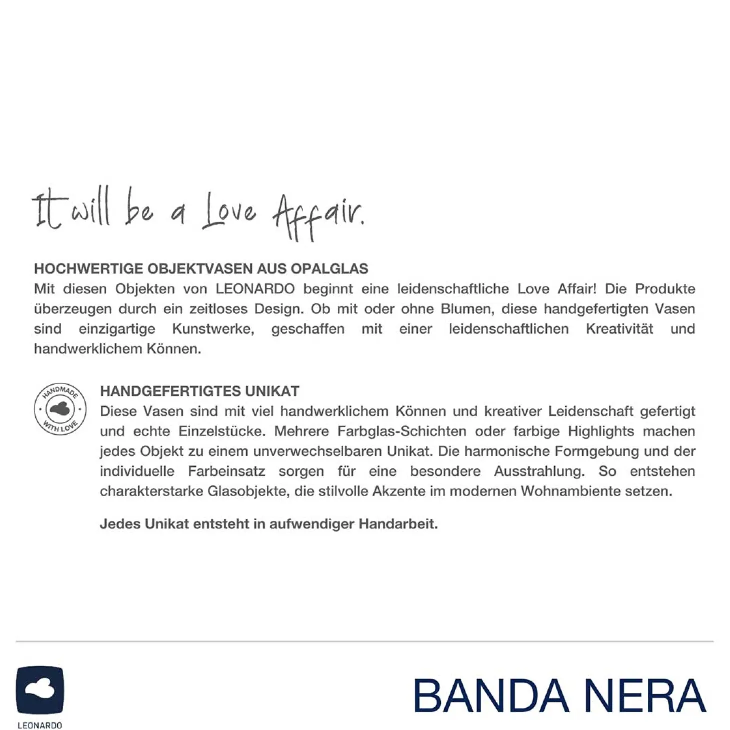 Entdecke die faszinierende Vase BANDA NERA! Handgearbeitetes Glas verschmilzt hier zu einem Kunstwerk, das deine Sinne verführt. Ob mit üppigen Blumen oder allein, sie ist stets ein Blickfang. Doch BANDA NERA ist mehr als eine Vase – sie ist eine leidenschaftliche Love-Affäre mit Ästhetik und Handwerkskunst. Jede Vase ist ein Unikat, einzigartig wie du. Tauche ein in die Welt des Designs und der Eleganz. Verleihe deinem Zuhause mit BANDA NERA einen Hauch von Exklusivität. Nutze sie auch als Windlicht und lass ihr warmes Licht deine Räume erhellen. Gönn dir das Besondere!